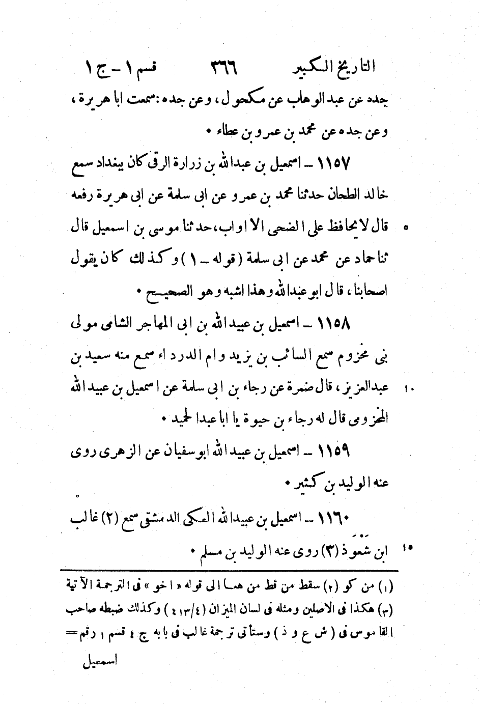 1158 - اسمعيل بن عبيد الله بْن أَبِي المهاجر الشامي مولى بني مخزوم سَمِعَ السائب بْن يزيد وأم الدرداء سَمِعَ منه سَعِيد بْن عَبْد العزيز، قَالَ ضمرة عَنْ رجاء بْن أَبِي سَلَمَةَ عَنْ اسمعيل بن عبيد الله المخزومي قَالَ لَهُ رجاء بْن حيوة يا ابا عبد الحميد.