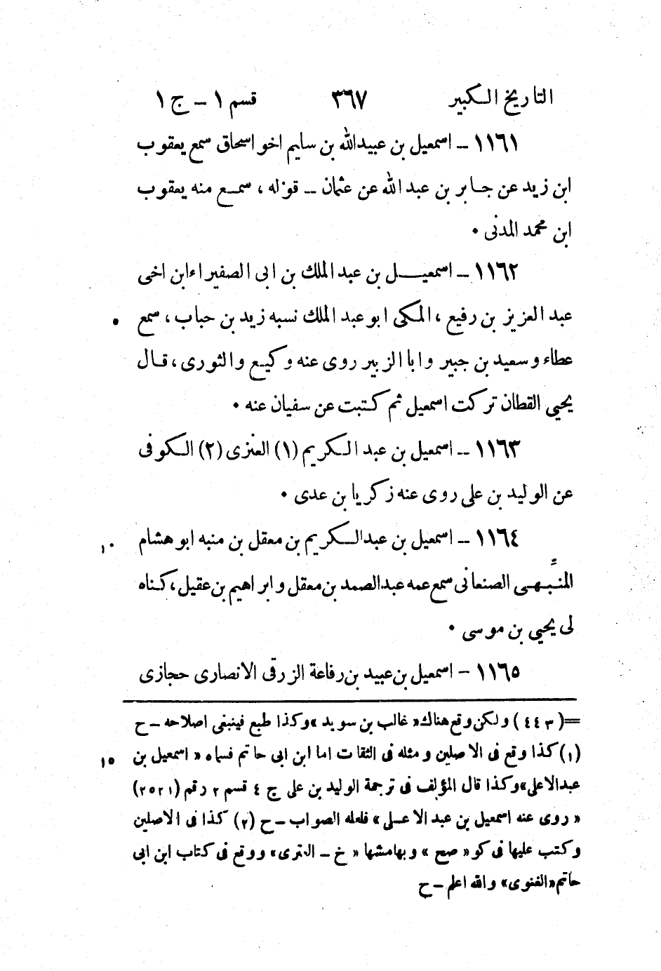1162 - اسمعيل بْن عَبْد الملك بْن أَبِي الصفِيراء ابْن أخي عَبْد العزيز بْن رفِيع، الْمَكِّيّ أَبُو عَبْد الملك نسبه زيد بْن حباب، سَمِعَ عطاء وسَعِيد بْن جُبَيْر وأبا الزبير روى عَنْهُ وكيع والثوري، قَالَ يحيى القطان تركت اسمعيل ثم كتبت عن سفيان عنه.