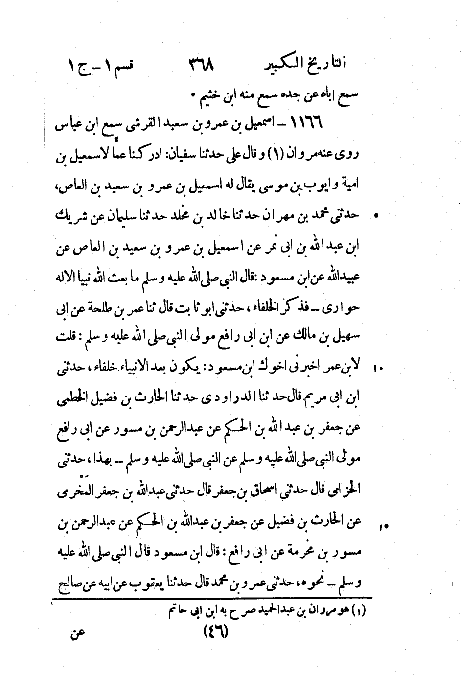 1166 - اسمعيل بْن عَمْرو بْن سَعِيد الْقُرَشِيّ سَمِعَ ابْن عَبَّاس روى عَنْهُ مروان (1) وقَالَ علي حَدَّثَنَا سفيان: ادركنا عما لاسمعيل بْن أمية وأيوب بْن مُوسَى يقال لَهُ اسمعيل بْن عَمْرو بْن سَعِيد بْن العاص، حَدَّثَنِي مُحَمَّدُ بْنُ مِهْرَانَ حَدَّثَنَا خَالِد بْنُ مَخْلَدٍ حدثنا سليمان عن شريك ابن عبد الله بن ابى نمر عن اسمعيل بْن عَمْرو بْن سَعِيد بْن الْعَاصِ عَنِ عبيد الله ابن مَسْعُودٍ: قَالَ النَّبِيّ صَلَّى اللَّهُ عَلَيْهِ وَسَلَّمَ مَا بَعَثَ اللَّهُ نَبِيًّا إِلا لَهُ حَوَارِيٌّ - فَذَكَرَ الْخُلَفَاءَ، حَدَّثَنِي أَبُو ثَابِتٍ قَالَ ثنا عُمَرُ بْنُ طَلْحَةَ عَنْ أَبِي سُهَيْلِ بْنِ مَالِكٍ عَنِ ابْنِ أَبِي رَافِعٍ مَوْلَى النَّبِيّ صَلَّى اللَّهُ عَلَيْهِ وَسَلَّمَ: قُلْتُ لابْنِ عُمَرَ أَخْبَرَنِي أَخُوكُ ابْنُ مَسْعُود: يَكُونُ بَعْدَ الأَنْبِيَاءِ خُلَفَاءُ، حَدَّثَنِي ابْنُ أَبِي مَرْيَمَ قَالَ حَدَّثَنَا الدَّرَاوَرْدِيُّ حَدَّثَنَا الْحَارِثُ بْنُ فُضَيْلٍ الْخَطْمِيُّ