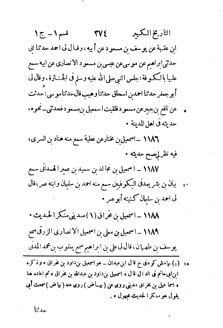 1189 - اسمعيل بن معلى بن اسمعيل الْأَنْصَارِيّ الزرقي سَمِعَ يوسف بْن طهمان، قَالَ لى على بن ابراهيم يعقوب بن محمد المدنى