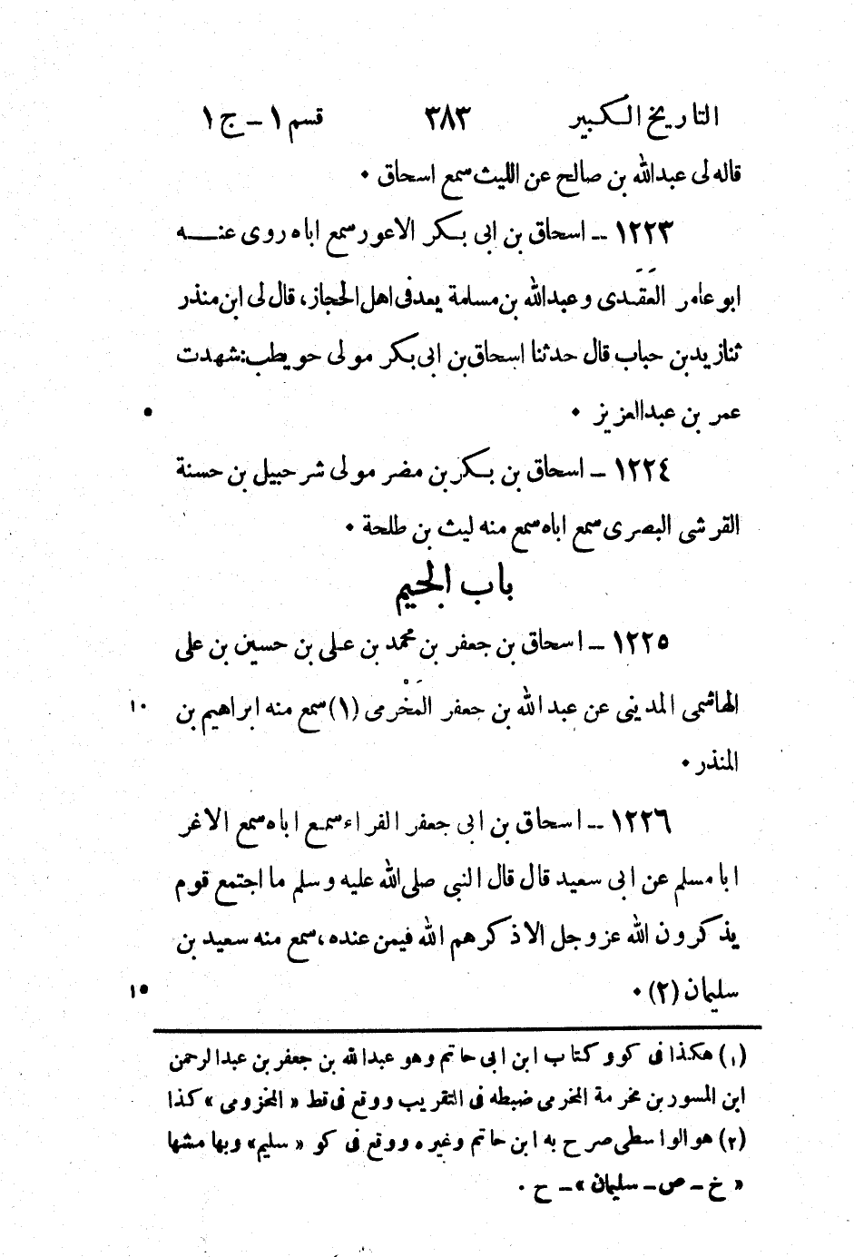 1225 - إِسْحَاق بْن جَعْفَر بْن مُحَمَّد بْن علي بْن حسين بْن علي الهاشمي المديني عَنْ عَبْد اللَّه بْن جَعْفَر المخرمي (1) سَمِعَ منه إِبْرَاهِيم بْن المنذر.
