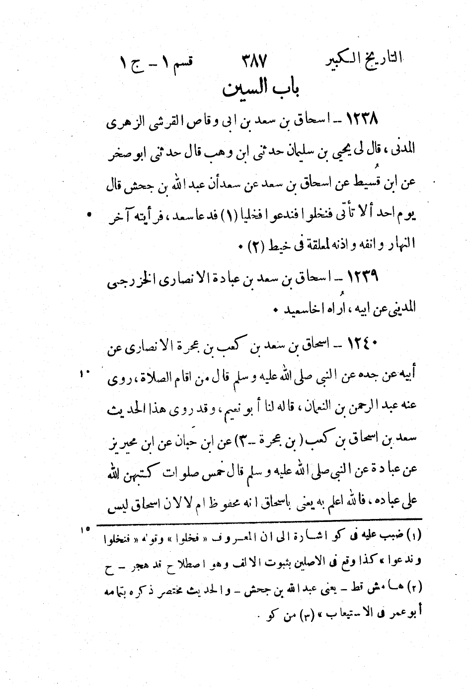 1240 - اسحاق بن سعد بن بْنِ كَعْبِ بْنِ عُجْرَةَ الْأَنْصَارِيّ عَنْ أَبِيهِ عَنْ جَدِّهِ عَنِ النَّبِيِّ صَلَّى اللَّهُ عَلَيْهِ وَسَلَّمَ قَالَ من أَقَامَ الصَّلاةَ، رَوَى عَنْهُ عَبْدُ الرَّحْمَن بْنِ النُّعْمَانِ، قَالَهُ لَنَا أَبُو نُعَيْمٍ، وقد روى هذا الحديث سَعْدِ بْنِ إِسْحَاقَ بْنِ كَعْبِ (بْنِ عُجْرَةَ - 3) عَنِ ابْن حبان عَنِ ابْن محيريز عَنْ عُبَادَةَ عَنِ النَّبِيِّ صَلَّى اللَّهُ عَلَيْهِ وَسَلَّمَ قَالَ خَمْسُ صَلَوَاتٍ كَتَبَهُنَّ اللَّهُ عَلَى عِبَادِهِ، فاللَّه أعلم بِهِ يَعْنِي بإِسْحَاق أَنَّهُ محفوظ أم لا لأن إِسْحَاق لَيْسَ