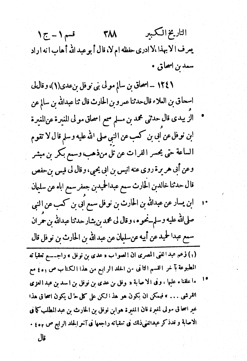(1) زعم عبد الغنى المصرى ان الصواب " عدى بن نوفل " راجع تعقباته المطبوعة بآخر القسم الثاني من الجلد الرابع من هذا الكتاب ص 451 مع ما علقناه عليها، وفى الاصابة " نوفل بْن عدي بْن نوفل بْن أسد بن عبد العزى القرشى.." فيمكن ان يكون هو هذا لكن على كل حال يكون اسحاق هذا غير اسحاق مولى لمغيرة فان المغيرة هو ابن نوفل بن الحارث بن عبد المطلب كما في الاصابة وقد ذكر عبد الغنى ذلك في تعقباته راجعها في آخر الجلد الرابع ص 452.