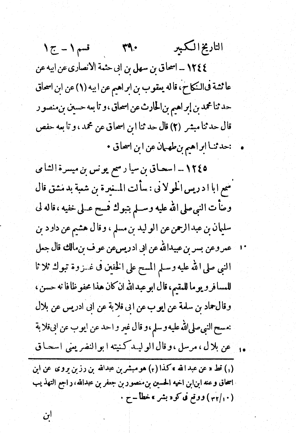 1244 - إِسْحَاق بْن سهل بْن أَبِي حثمة الْأَنْصَارِيّ عَنْ أَبِيه عَنْ عَائِشَةَ فِي النكاح، قَالَه يَعْقُوبَ بْنِ إِبْرَاهِيمَ عَنْ أَبِيهِ (1) عَنِ ابْنِ إِسْحَاق حَدَّثَنَا مُحَمَّد بْن إِبْرَاهِيم بْن الحارث عَنْ إِسْحَاق، وتابعه حسين بْن منصور قَالَ حَدَّثَنَا مبشر (2) قَالَ حَدَّثَنَا ابْن إِسْحَاق عَنْ مُحَمَّد، وتابعه حفص: حَدَّثَنَا إِبْرَاهِيم بْن طهمان عَنِ ابْن إِسْحَاق.