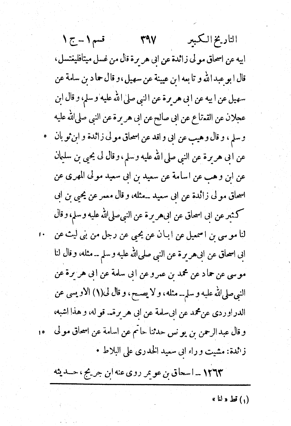 أَبِي إِسْحَاق عَنْ أَبِي هُرَيْرَةَ عَنِ النَّبِيِّ صَلَّى اللَّهُ عَلَيْهِ وَسَلَّمَ - مِثْلَهُ، وَقَالَ لَنَا مُوسَى عَنْ حَمَّادٍ عَنْ مُحَمَّد بْن عَمْرو عَنْ أَبِي سَلَمَةَ عَنْ أَبِي هُرَيْرَةَ عَنِ النَّبِيِّ صَلَّى اللَّهُ عَلَيْهِ وَسَلَّمَ - مِثْلَهُ، ولا يصح، وقَالَ لِي (1) الأويسي عَنِ الدراوردي عَنْ مُحَمَّد عَنْ أَبِي سَلَمَةَ عَنْ أَبِي هُرَيْرَةَ - قولُهُ، وَهَذَا أَشْبَهُ، وقَالَ عَبْد الرَّحْمَن بْن يونس حَدَّثَنَا حاتم عَنْ أسامة عَنْ إِسْحَاق مولى زائدة، مشيت وراء أَبِي سَعِيد الخدري على البلاط.