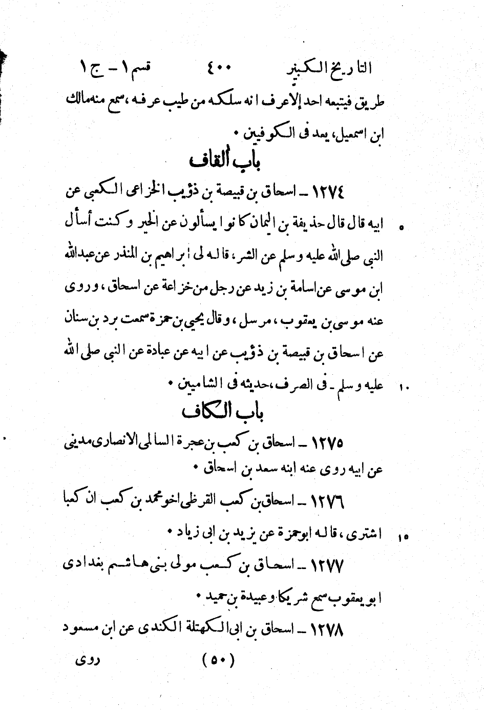1274 - إِسْحَاق بْنُ قَبِيصَةَ بْنِ ذُؤَيْبٍ الْخُزَاعِيُّ الْكَعْبِيُّ عَنْ أَبِيهِ قَالَ قَالَ حُذَيْفَةُ بْنُ الْيَمَانِ كَانُوا يَسْأَلُونَ عَنِ الْخَيْرِ وَكُنْتُ أَسْأَلُ النَّبِيَّ صَلَّى اللَّهُ عَلَيْهِ وَسَلَّمَ عَنِ الشَّرِّ، قَالَهُ لِي إِبْرَاهِيمُ بن المنذر عن عبد الله ابن مُوسَى عَنْ أُسَامَةَ بْنِ زَيْدٍ عَنْ رَجُلٍ مِنْ خُزَاعَةَ عَنْ إِسْحَاق، وروى عَنْهُ مُوسَى بْن يعقوب، مرسل، وقَالَ يحيى بْن حمزة سمعت برد بْن سنان عَنْ إِسْحَاق بْن قبيصة بْن ذؤيب عَنْ أَبِيه عَنْ عُبَادَةَ عَنِ النَّبِيِّ صَلَّى اللَّهُ عَلَيْهِ وَسَلَّمَ - فِي الصرف، حديثه فِي الشاميين.