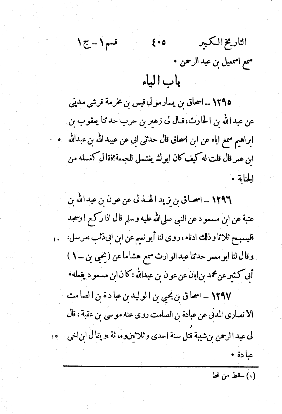 1295 - إِسْحَاق بْن يسار مولى قيس بْن مخرمة قرشي مديني عَنْ عَبْد اللَّه بْن الحارث، قَالَ لِي زُهَيْرُ بْنُ حَرْبٍ حَدَّثَنَا يَعْقُوبُ بْنُ إِبْرَاهِيمَ سَمِعَ أَبَاهُ عَنِ ابْنِ إِسْحَاقَ قَالَ حَدَّثَنِي ابى عن عبيد الله بن عبد الله ابن عُمَرَ قَالَ قُلْتُ لَهُ كَيْفَ كَانَ أَبُوكَ يَغْتَسِلُ لِلْجُمُعَةِ؟ فَقَالَ كَغُسْلِهِ مِنَ الْجَنَابَةِ.