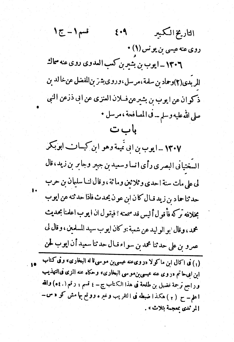 1307 - أيوب بْن أَبِي تميمة وهو ابْن كيسان أَبُو بكر السختياني الْبَصْرِيّ رأى أنسا وسَعِيد بْن جُبَيْر وجَابِر بْن زيد، قَالَ لي علي مات سنة إحدى وثلاثين ومائة، وقَالَ لنا سُلَيْمَان بْن حرب حَدَّثَنَا حماد بْن زَيْد قَالَ كَانَ ابْن عون يحدث فإذا حدثته عَنْ أيوب بخلافه تركه فأقول ألَيْسَ قد سمعته؟ فَيَقُولُ إن أيوب أعلمنا بحديث مُحَمَّد، وقَالَ أَبُو الوليد عَنْ شُعْبَة: وكَانَ أيوب سيد الْمُسْلِمين، وقَالَ لي عَمْرو بْن علي حَدَّثَنَا مُحَمَّد بْن سواء قَالَ حَدَّثَنَا سَعِيد أن ايوب لحن