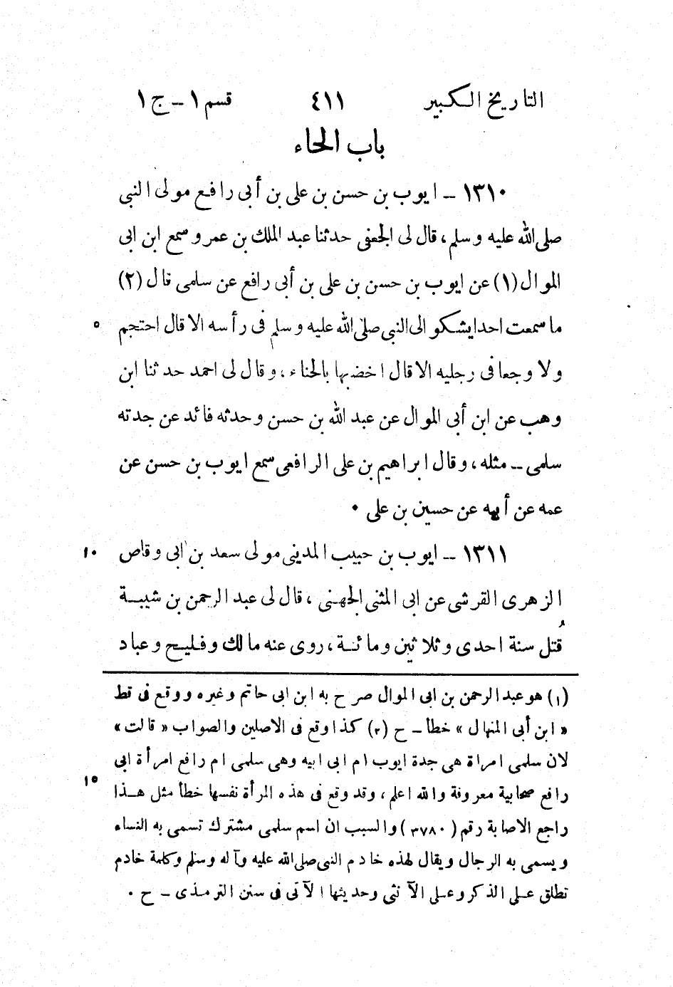 (1) هو عبد الرحمن بن ابى الموال صرح به ابن ابى حاتم وغيره ووقع في قط " ابن أبى المنهال " خطأ - ح (2) كذا وقع في الاصلين والصواب " قالت " لان سلمى امراة هي جدة ايوب ام ابى ابيه وهى سلمى ام رافع امرأة ابى رافع صحابية معروفة والله اعلم، وقد وقع في هذه المرأة نفسها خطأ مثل هذا راجع الاصابة رقم (3780) والسبب ان اسم سلمى مشترك تسمى به النساء ويسمى به الرجال ويقال لهذه خادم النبي صلى الله عليه وآله وكلمة خادم تطلق على الذكر وعلى الآنثى وحديثها الآتى في سنن الترمذي - ح.