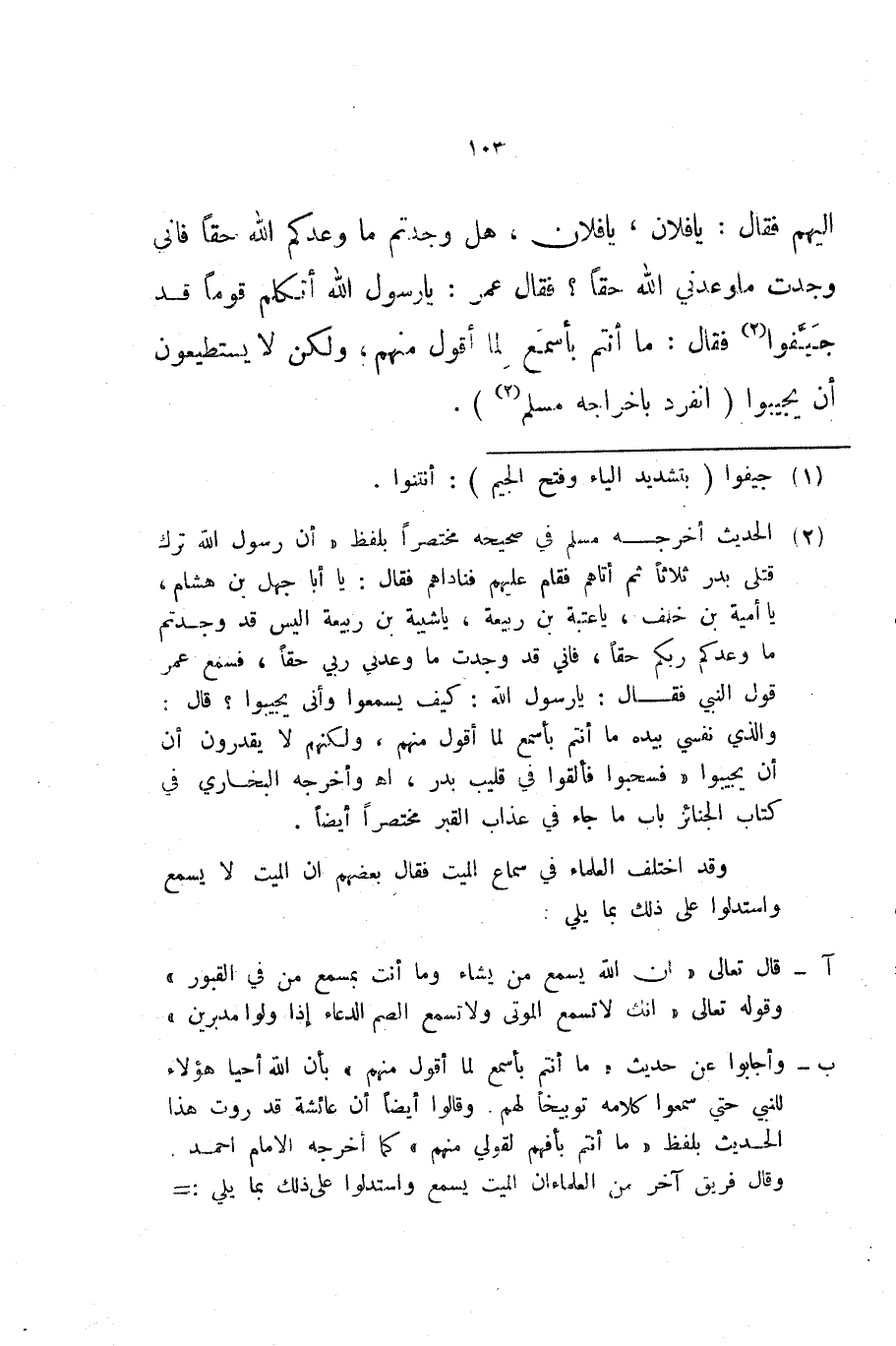 إليهم فقال يا فلان يا فلان هل وجدتم ما وعدكم الله حقا فاني وجدت ما وعدني الله حقا فقال عمر يا رسول الله أتكلم قوما قد جيفوا فقال ما أنتم بأسمع لما أقول منهم ولكن لا يستطيعون أن يجيبوا انفرد باخراجه مسلم