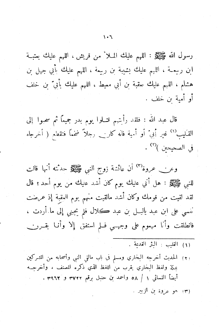 وعن عروة أن عائشة زوج النبي صلى الله عليه و سلم حدثته أنها قالت للنبي صلى الله عليه و سلم هل أتي عليك يوم كان أشد عليك من يوم أحد قال لقد لقيت من قومك وكان أشد ما لقيت منهم يوم العقبة إذ عرضت نفسي على ابن عبد يا ليل بن عبد كلال فلم يجبني إلى ما أردت فانطلقت وأنا مهموم على وجهي فلم استفق إلا وأنا بقرن