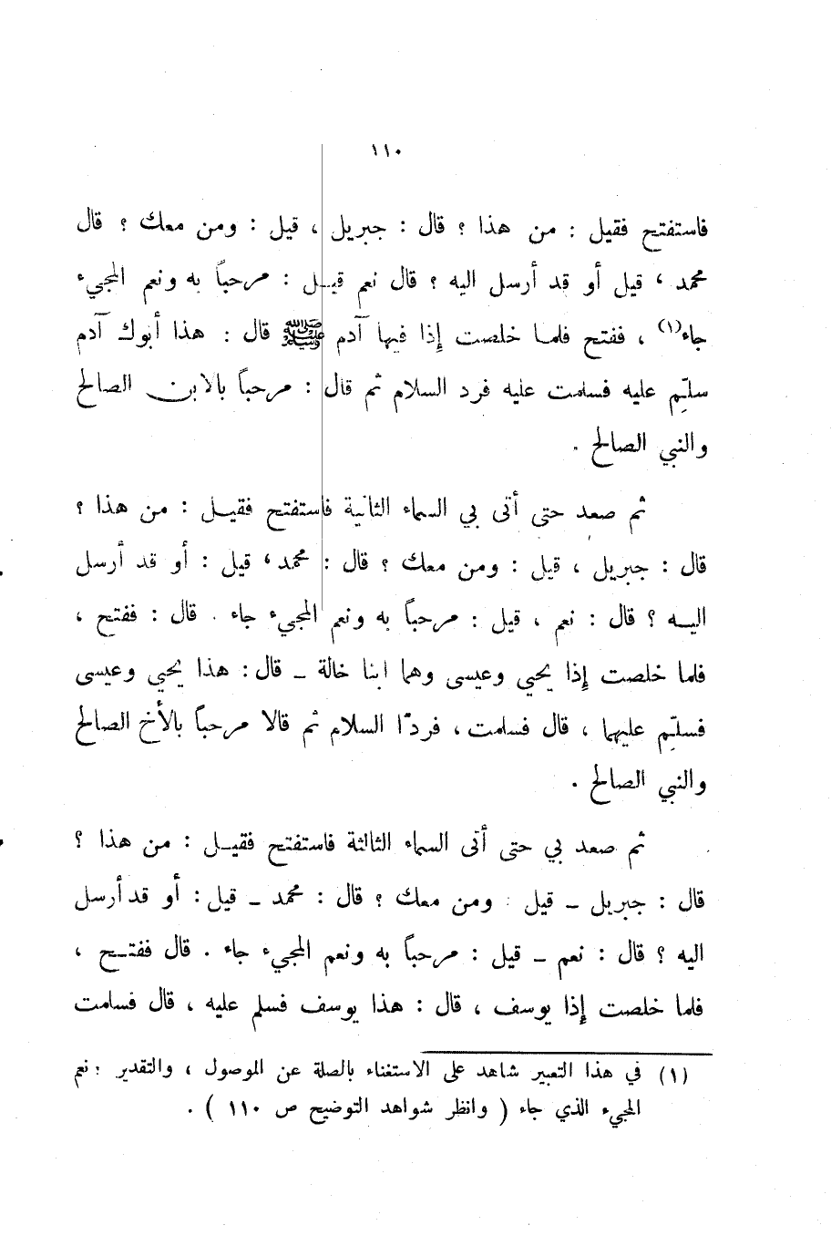فاستفتح فقيل من هذا قال جبريل قيل ومن معك قال محمد قيل أو قد أرسل إليه قال نعم قيل مرحبا به ونعم المجيء جاء ففتح فلما خلصت إذا فيها آدم صلى الله عليه و سلم قال هذا أبوك آدم سلم عليه فسلمت عليه فرد السلام ثم قال مرحبا بالابن الصالح والنبي الصالح