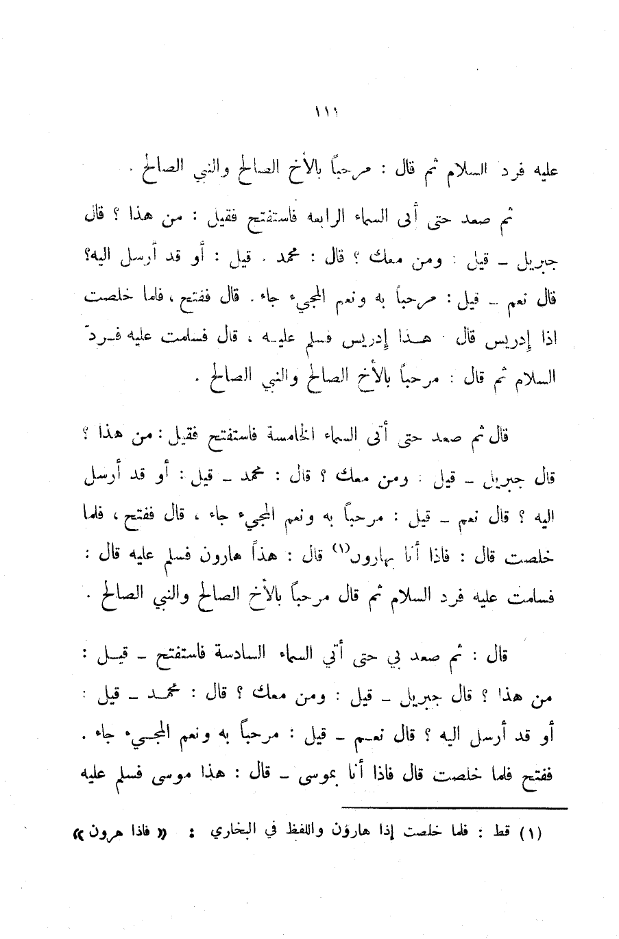 قال ثم صعد حتى أتى السماء الخامسة فاستفتح فقيل من هذا قال جبريل قيل ومن معك قال محمد قيل أو قد أرسل إليه قال نعم قيل مرحبا به ونعم المجيء جاء قال ففتح فلما خلصت قال فإذا أنا بهارون قال هذا هارون فسلم عليه قال فسلمت عليه فرد السلام ثم قال مرحبا بالأخ الصالح والنبي الصالح