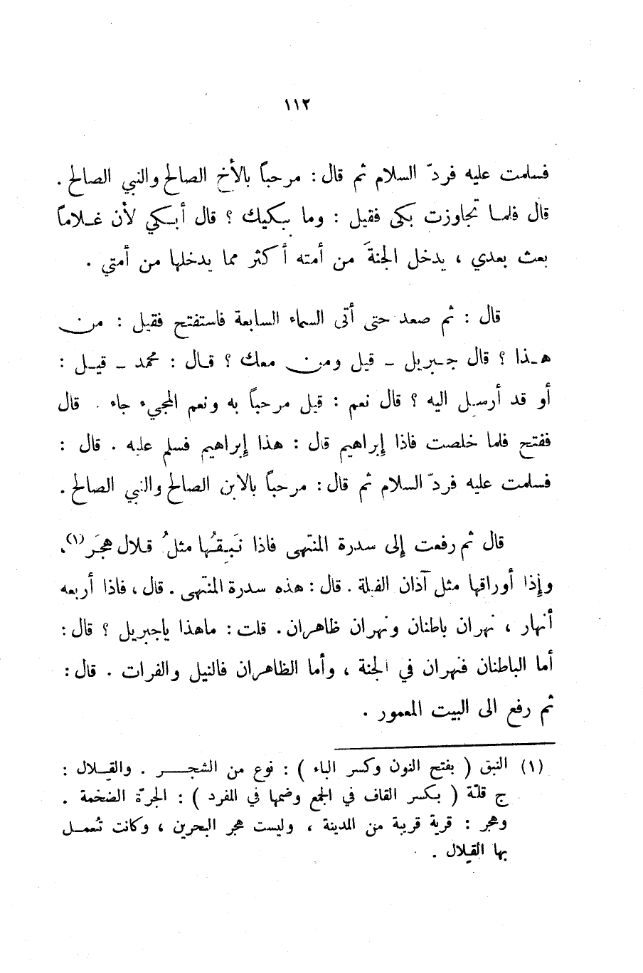 قال ثم رفعت إلى سدرة المنتهى فإذا نبقها مثل قلال هجر وإذا أوراقها مثل آذان الفيلة قال هذه سدرة المنتهى قال فإذا أربعة أنهار نهران باطنان ونهران ظاهران قلت ما هذا يا جبريل قال أما الباطنان فنهران في الجنة وأما الظاهران فالنيل والفرات قال ثم رفع إلى البيت المعمور