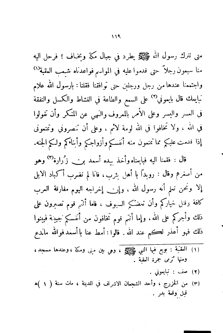 متى نترك رسول الله صلى الله عليه و سلم يطرد في جبال مكة ويخاف فرحل إليه منا سبعون رجلا حتى قدموا عليه في المواسم فواعدناه شعب العقبة واجتمعنا عندها من رجل ورجلين حتى توافقنا فقلنا يا رسول الله علام نبايعك قال بايعوني على السمع والطاعة في النشاط والكسل والنفقة في العسر واليسر وعلى الأمر بالمعروف والنهي عن المنكر وأن تقولوا في الله ولا تخافوا في الله لومة لائم وعلى أن تنصروني وتمنعوني إذا قدمت عليكم مما تمنعون منه أنفسكم وأزواجكم وأبناءكم ولكم الجنة