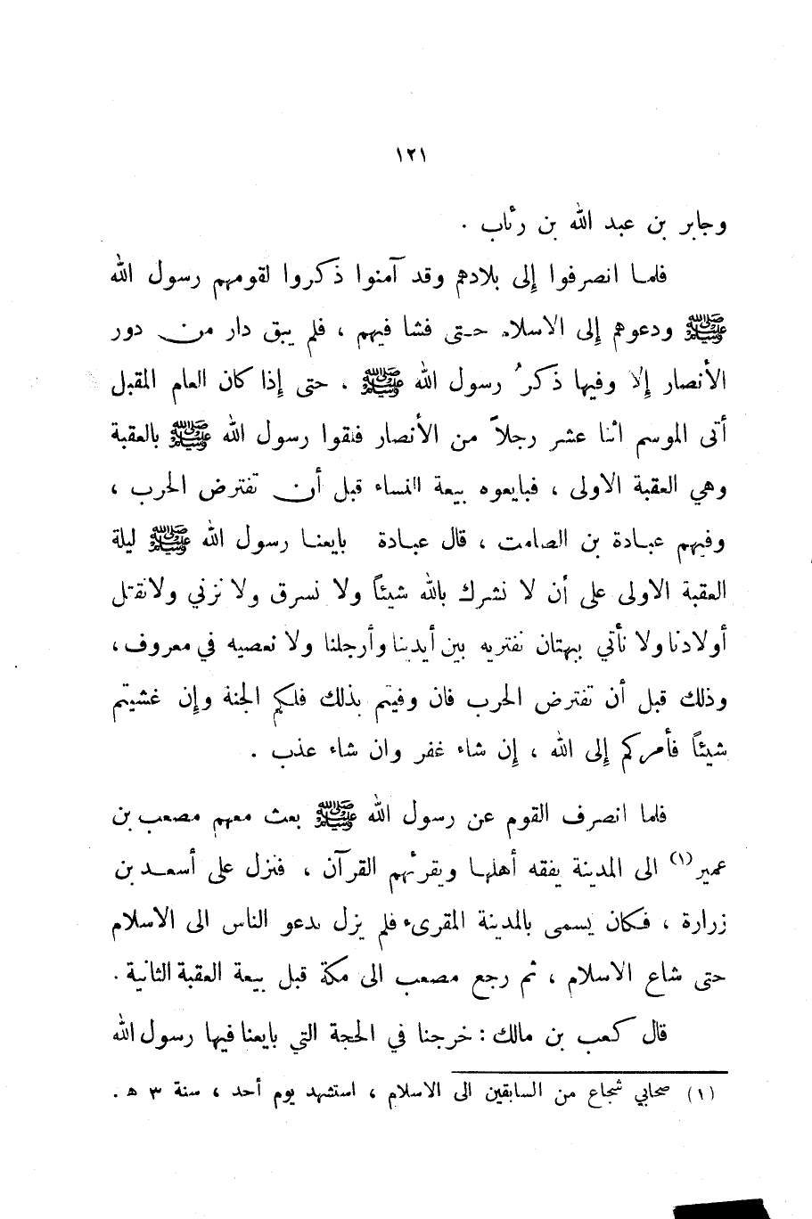 فلما انصرفوا إلى بلادهم وقد آمنوا ذكروا لقومهم رسول الله صلى الله عليه و سلم ودعوهم إلى الإسلام حتى فشا فيهم فلم يبق دار من دور الأنصار إلا وفيها ذكر رسول الله صلى الله عليه و سلم حتى إذا كان العام المقبل أتى الموسم اثنا عشر رجلا من الأنصار فلقوا رسول الله صلى الله عليه و سلم بالعقبة وهي العقبة الأولى فبايعوه بيعة النساء قبل أن تفترض الحرب وفيهم عبادة بن الصامت قال عبادة بايعنا رسول الله صلى الله عليه و سلم ليلة العقبة الأولى على أن لا نشرك بالله شيئا ولا نسرق ولا نزني ولا نقتل أولادنا ولا نأتي ببهتان نفتريه بين أيدينا وأرجلنا ولا نعصيه في معروف وذلك قبل أن تفترض الحرب فان وفيتم بذلك فلكم الجنة وإن غشيتم شيئا فأمركم إلى الله إن شاء غفر وإن شاء عذب
