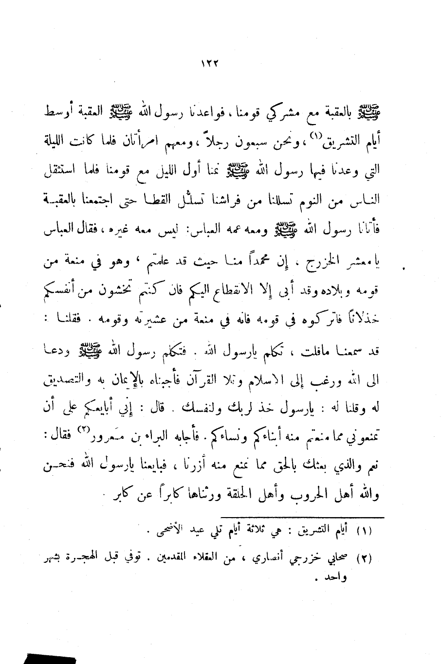 صلى الله عليه و سلم بالعقبة مع مشركي قومنا فواعدنا رسول الله صلى الله عليه و سلم العقبة أوسط أيام التشريق ونحن سبعون رجلا ومعهم امرأتان فلما كانت الليلة التي وعدنا فيها رسول الله صلى الله عليه و سلم نمنا أول الليل مع قومنا فلما استثقل الناس من النوم تسللنا من فراشنا تسلل القطا حتى اجتمعنا بالعقبة فأتانا رسول الله صلى الله عليه و سلم ومعه عمه العباس ليس معه غيره فقال العباس يا معشر الخزرج إن محمدا منا حيث قد علمتم وهو في منعة من قومه وبلاده وقد أبى إلا الانقطاع إليكم فإن كنتم تخشون من أنفسكم خذلانا فاتركوه في قومه فإنه في منعة من عشيرته وقومه فقلنا