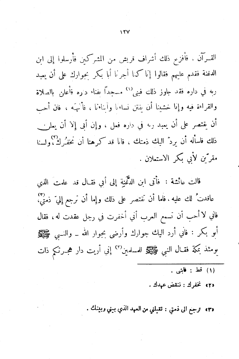 قالت عائشة فأتى ابن الدغنة إلى أبي فقال قد علمت الذي عاقدت لك عليه فأما أن تقتصر على ذلك وإما أن ترجع إلي ذمتي فإني لا أحب أن تسمع العرب أني أخفرت في رجل عقدت له فقال أبو بكر فإني أرد إليك جوارك وأرضى بجوار الله والنبي صلى الله عليه و سلم يومئذ بمكة فقال النبي صلى الله عليه و سلم للمسلمين إني أريت دار هجرتكم ذات