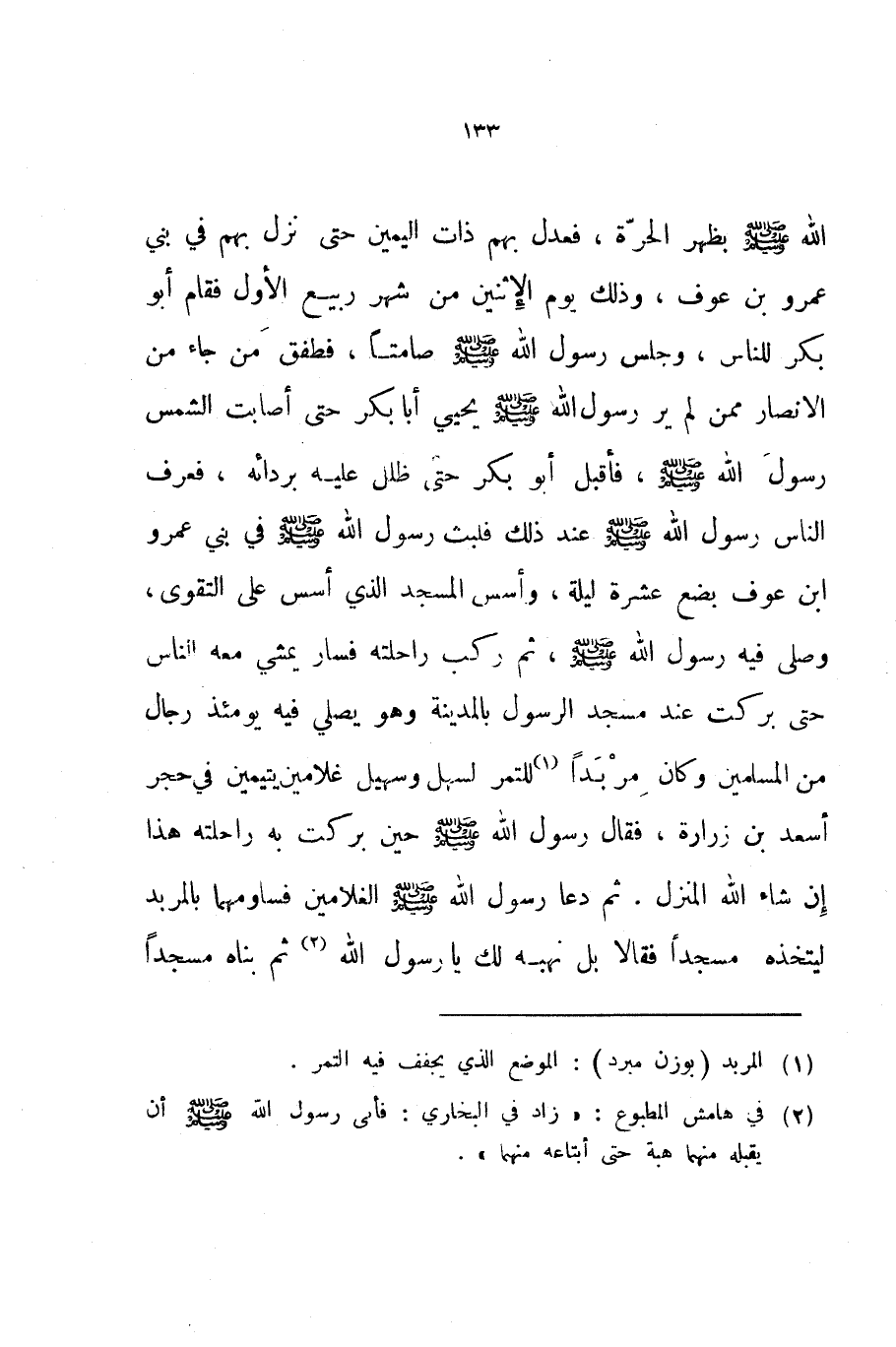 الله صلى الله عليه و سلم بظهر الحرة فعدل بهم ذات اليمين حتى نزل بهم في بني عمرو بن عوف وذلك يوم الإثنين من شهر ربيع الأول فقام أبو بكر للناس وجلس رسول الله صلى الله عليه و سلم صامتا فطفق من جاء من الأنصار ممن لم ير رسول الله صلى الله عليه و سلم يحيي أبا بكر حتى أصابت الشمس رسول الله صلى الله عليه و سلم فأقبل أبو بكر حتى ظلل عليه بردائه فعرف الناس رسول الله صلى الله عليه و سلم عند ذلك فلبث رسول الله صلى الله عليه و سلم في بني عمرو ابن عوف بضع عشرة ليلة وأسس المسجد الذي أسس على التقوى وصلى فيه رسول الله صلى الله عليه و سلم ثم ركب راحلته فسار يمشي معه الناس حتى بركت عند مسجد الرسول بالمدينة وهو يصلي فيه يومئذ رجال من المسلمين وكان مربدا للتمر لسهل وسهيل غلامين يتيمين في حجر أسعد بن زرارة فقال رسول الله صلى الله عليه و سلم حين بركت به راحلته هذا إن شاء الله المنزل ثم دعا رسول الله صلى الله عليه و سلم الغلامين فساومهما بالمربد ليتخذه مسجدا فقالا بل نهبه لك يا رسول الله ثم بناه مسجدا