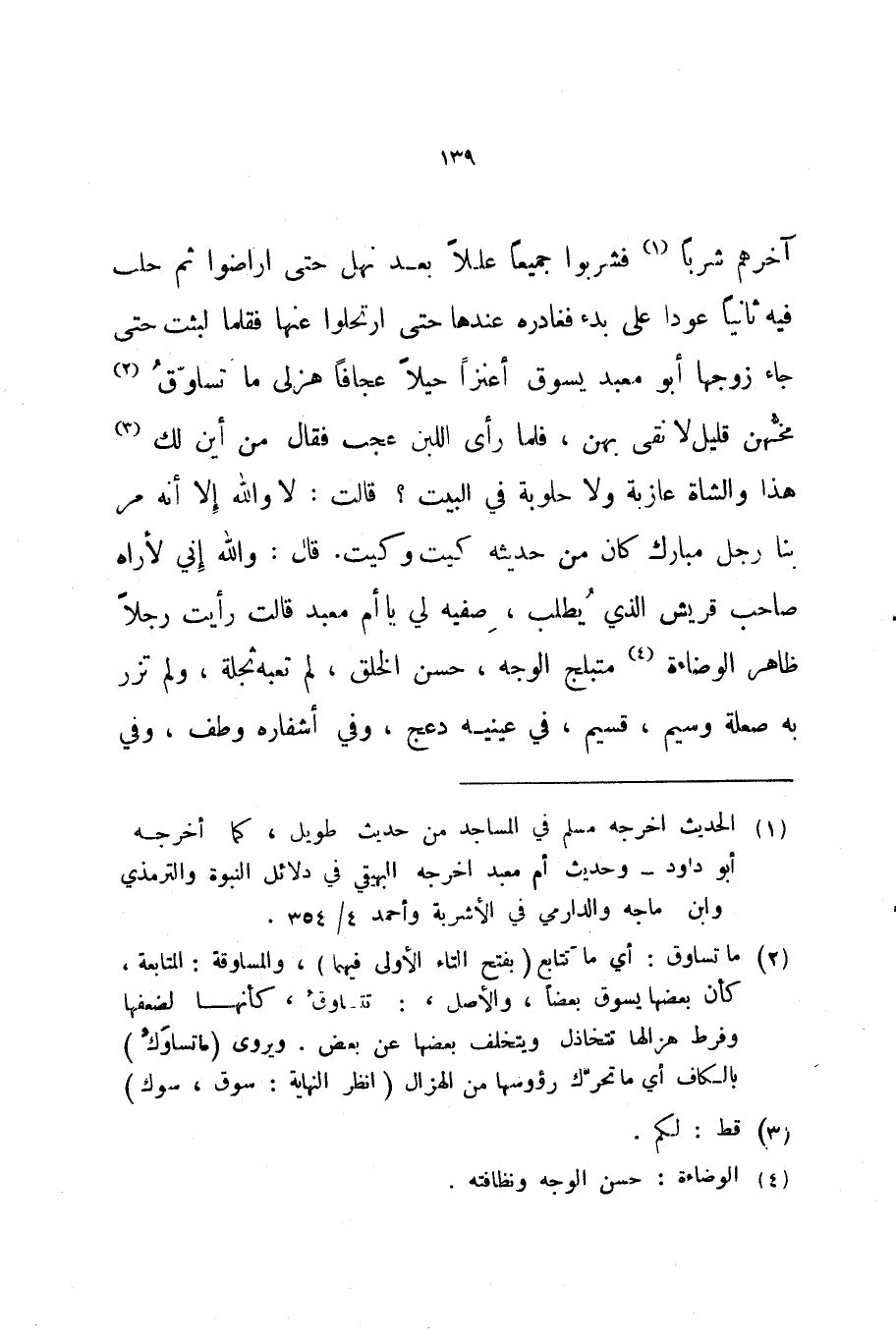 آخرهم شربا فشربوا جميعا عللا بعد نهل حتى اراضوا ثم حلب فيه ثانيا عودا على بدء فغادره عندها حتى ارتحلوا عنها فقلما لبثت حتى جاء زوجها أبو معبد يسوق أعنزا حيلا عجافا هزلى ما تساوق مخهن قليل لا نقى بهن فلما رأى اللبن عجب فقال من أين لك هذا والشاة عازبة ولا حلوبة في البيت قالت لا والله إلا أنه مر بنا رجل مبارك كان من حديثه كيت وكيت قال والله إني لأراه صاحب قريش الذي يطلب صفيه لي يا أم معبد قالت رأيت رجلا ظاهر الوضاءة متبلج الوجه حسن الخلق لم تعبه ثجلة ولم تزر به صعلة وسيم قسيم في عينيه دعج وفي أشفاره وطف وفي