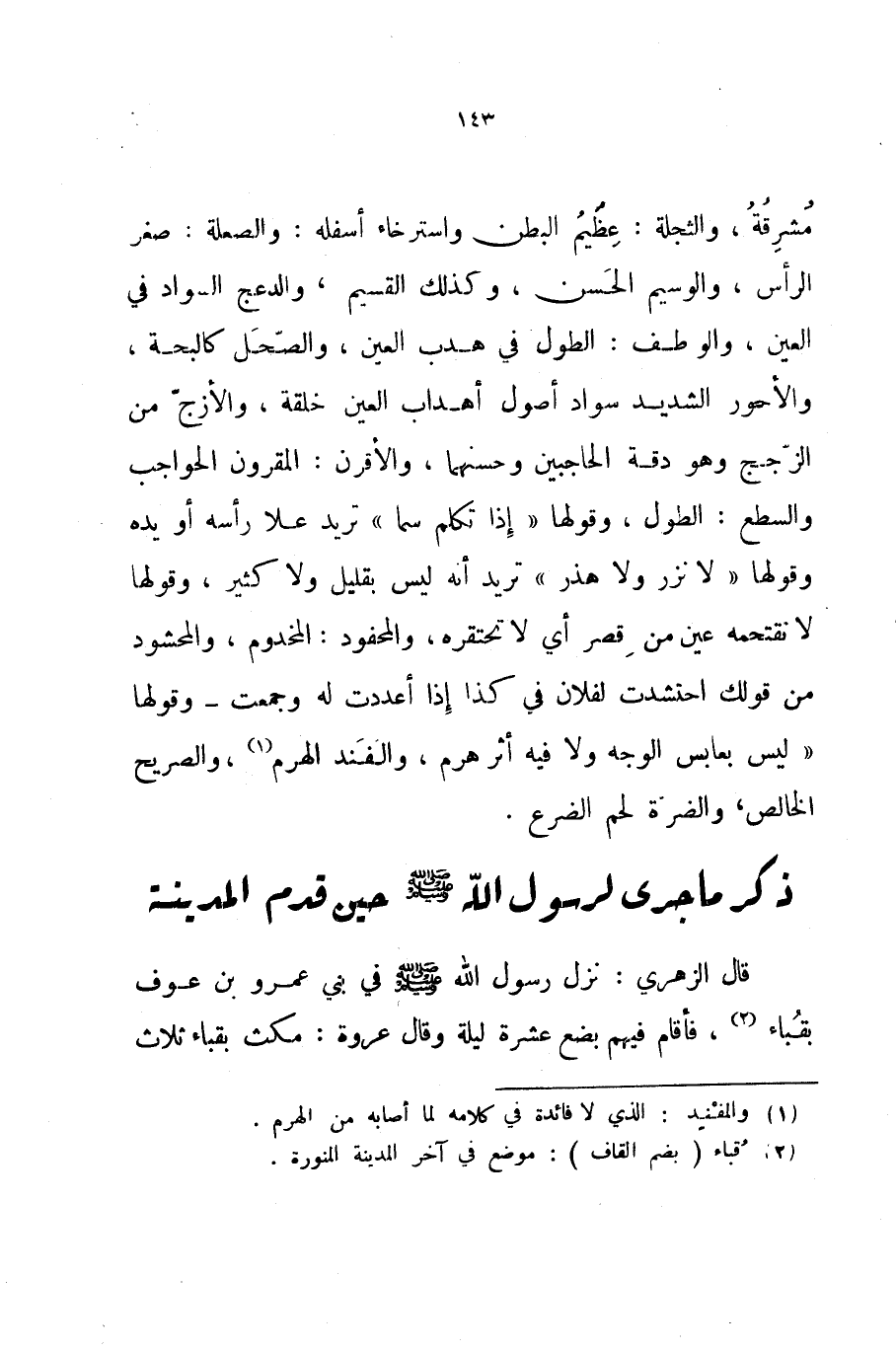 مشرقة والثجلة عظيم البطن واسترخاء أسفله والصعلة صغر الرأس والوسيم الحسن وكذلك القسيم والدعج السواد في العين والوطف الطول في هدب العين والصحل كالبحة والأحور الشديد سواد أصول أهداب العين خلقه والأزج من الزجج وهو دقة الحاجبين وحسنهما والأقرن المقرون الحواجب والسطع الطول وقولها إذا تكلم سما تريد علا رأسه أو يده وقولها لا نزر ولا هذر تريد أنه ليس بقليل ولا كثير وقولها لا تقتحمه عين من قصر أي لا تحتقره والمحفود المخدوم والمحشود من قولك احتشدت لفلان في كذا إذا أعددت له وجمعت وقولها ليس بعابس الوجه ولا فيه أثر هرم والفند الهرم والصريح الخالص والضرة لحم الضرع