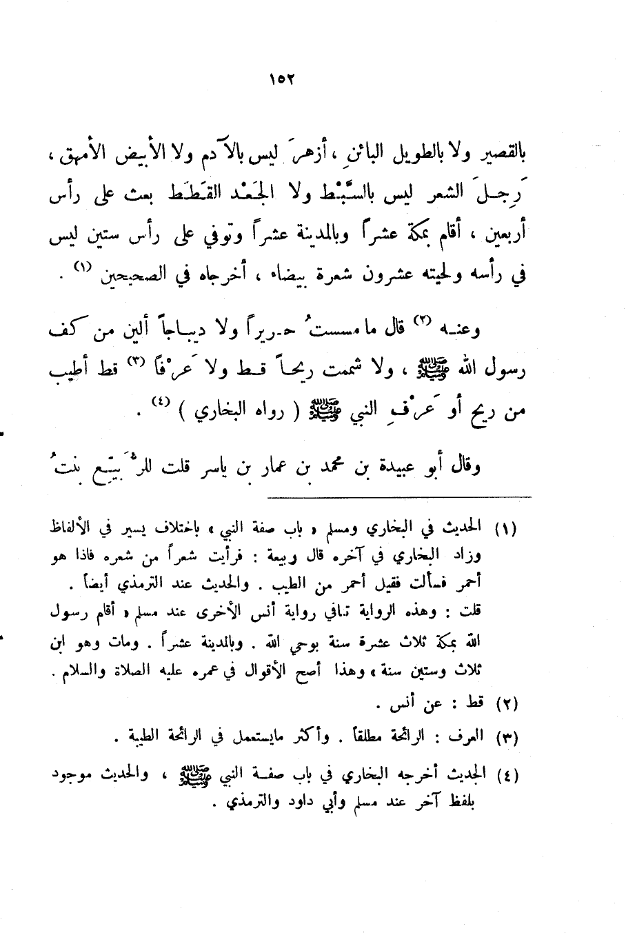 بالقصير ولا بالطويل البائن أزهر ليس بالآدم ولا الأبيض الأمهق رجل الشعر ليس بالسبط ولا الجعد القطط بعث على رأس أربعين أقام بمكة عشرا وبالمدينة عشرا وتوفي على رأس ستين ليس في رأسه ولحيته عشرون شعرة بيضاء أخرجاه في الصحيحين