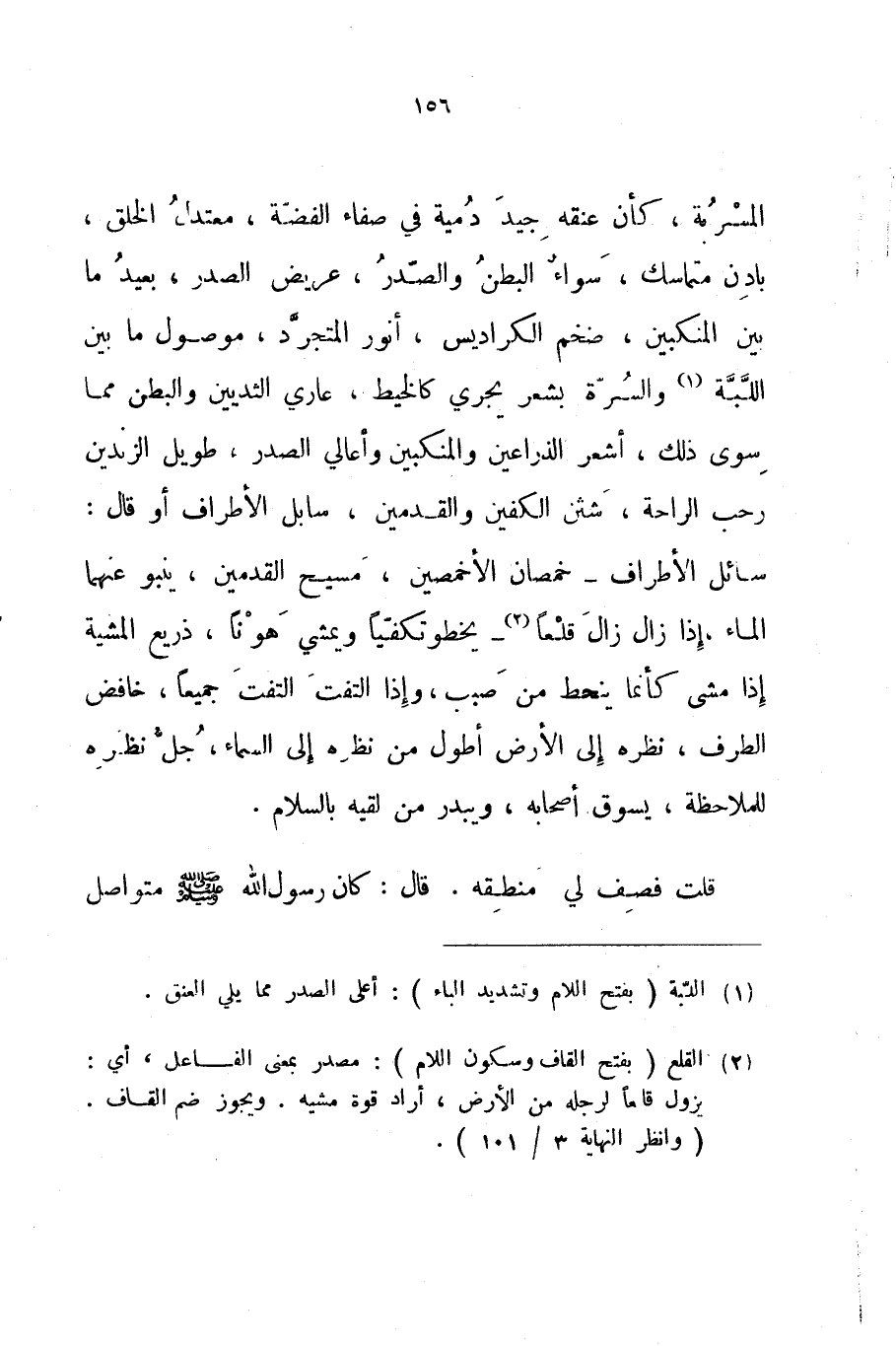 المسربة كأن عنقه جيد دمية في صفاء الفضة معتدل الخلق بادن متماسك سواء البطن والصدر عريض الصدر بعيد ما بين المنكبين ضخم الكراديس أنور المتجرد موصول ما بين اللبة والسرة بشعر يجري كالخيط عاري الثديين والبطن مما سوى ذلك أشعر الذراعين والمنكبين وأعالي الصدر طويل الزندين رحب الراحة شثن الكفين والقدمين سابل الأطراف أو قال سائل الأطراف خمصان الأخمصين مسيح القدمين ينبو عنهما الماء إذا زال زال قلعا يخطو تكفيا ويمشي هونا ذريع المشية إذا مشى كأنما ينحط من صبب وإذا التفت التفت جميعا خافض الطرف نظره إلى الأرض أطول من نظره إلى السماء جل نظره للملاحظة يسوق أصحابه ويبدر من لقيه بالسلام