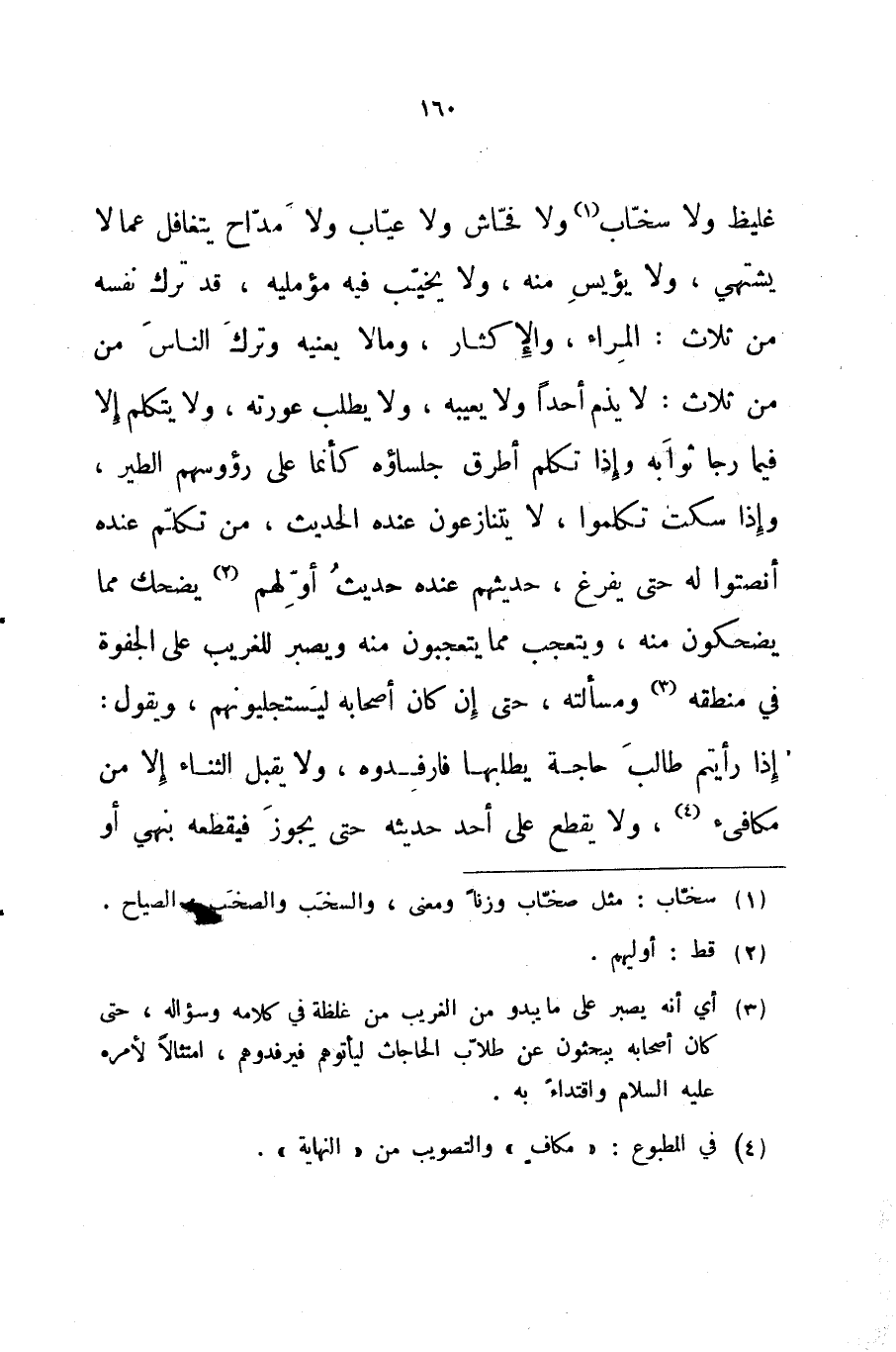 غليظ ولا سخاب ولا فحاش ولا عياب ولا مداح يتغافل عما لا يشتهي ولا يؤيس منه ولا يخيب فيه مؤمليه قد ترك نفسه من ثلاث المراء والإكثار ومالا يعنيه وترك الناس من من ثلاث لا يذم أحدا ولا يعيبه ولا يطلب عورته ولا يتكلم إلا فيما رجا ثوابه وإذا تكلم أطرق جلساؤه كأنما على رؤوسهم الطير وإذا سكت تكلموا لا يتنازعون عنده الحديث من تكلم عنده أنصتوا له حتى يفرغ حديثهم عنده حديث أولهم يضحك مما يضحكون منه ويتعجب مما يتعجبون منه ويصبر للغريب على الجفوة في منطقه ومسألته حتى إن كان أصحابه ليستجليونهم ويقول إذا رأيتم طالب حاجة يطلبها فارفدوه ولا يقبل الثناء إلا من مكافىء ولا يقطع على أحد حديثه حتى يجوز فيقطعه بنهي أو