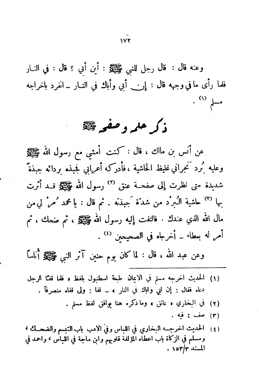 عن أنس بن مالك قال كنت أمشي مع رسول الله صلى الله عليه و سلم وعليه برد نجراني غليظ الحاشية فأدركه أعرابي فجبذه بردائه جبذة شديدة حتى نظرت إلى صفحة عنق رسول الله صلى الله عليه و سلم قد أثرت بها حاشية البرد من شدة جبذته ثم قال يا محمد مر لي من مال الله الذي عندك فالتفت إليه رسول الله صلى الله عليه و سلم ثم ضحك ثم أمر له بعطاء أخرجاه في الصحيحين