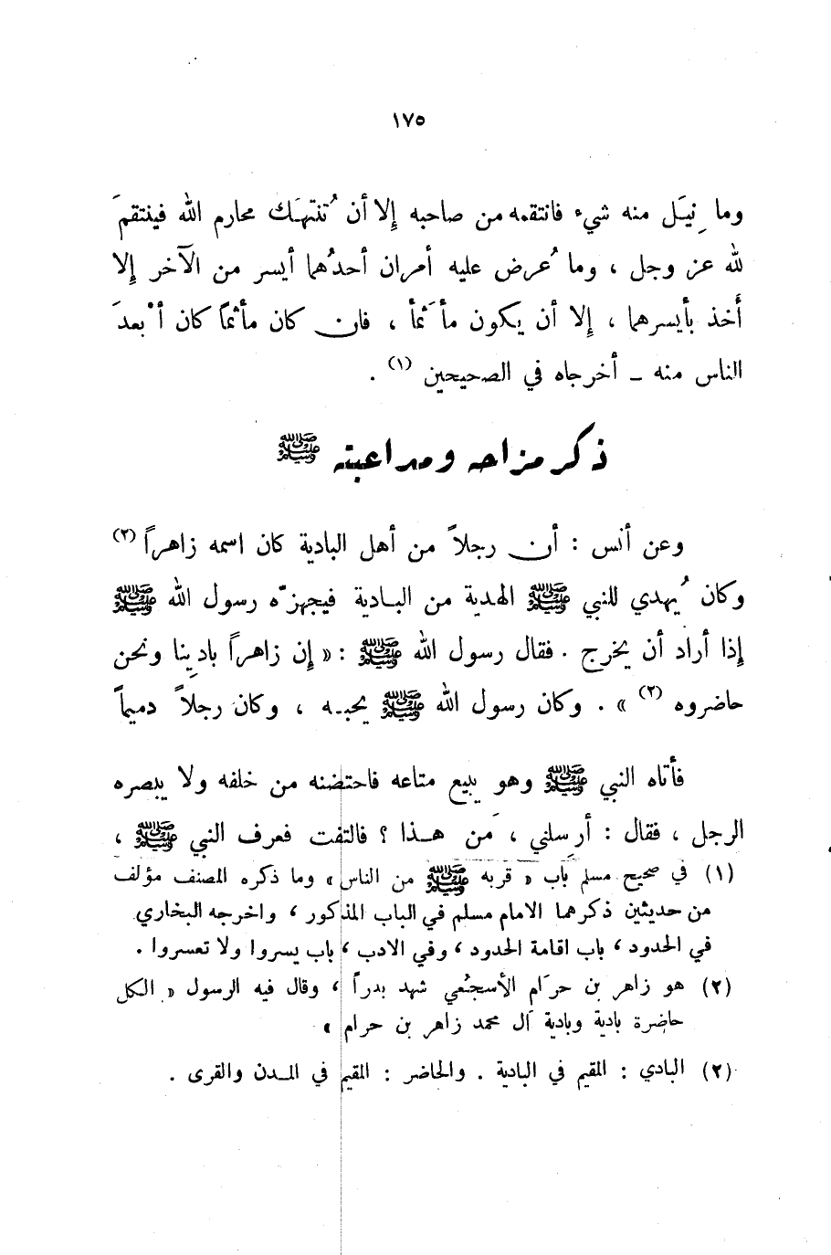وعن أنس أن رجلا من أهل البادية كان اسمه زاهرا وكان يهدي للنبي صلى الله عليه و سلم الهدية من البادية فيجهزه رسول الله صلى الله عليه و سلم إذا أراد أن يخرج فقال رسول الله صلى الله عليه و سلم إن زاهرا بادينا ونحن حاضروه وكان رسول الله صلى الله عليه و سلم يحبه وكان رجلا دميما فأتاه النبي صلى الله عليه و سلم وهو يبيع متاعه فاحتضنه من خلفه ولا يبصره الرجل فقال أرسلني من هذا فالتفت فعرف النبي صلى الله عليه و سلم