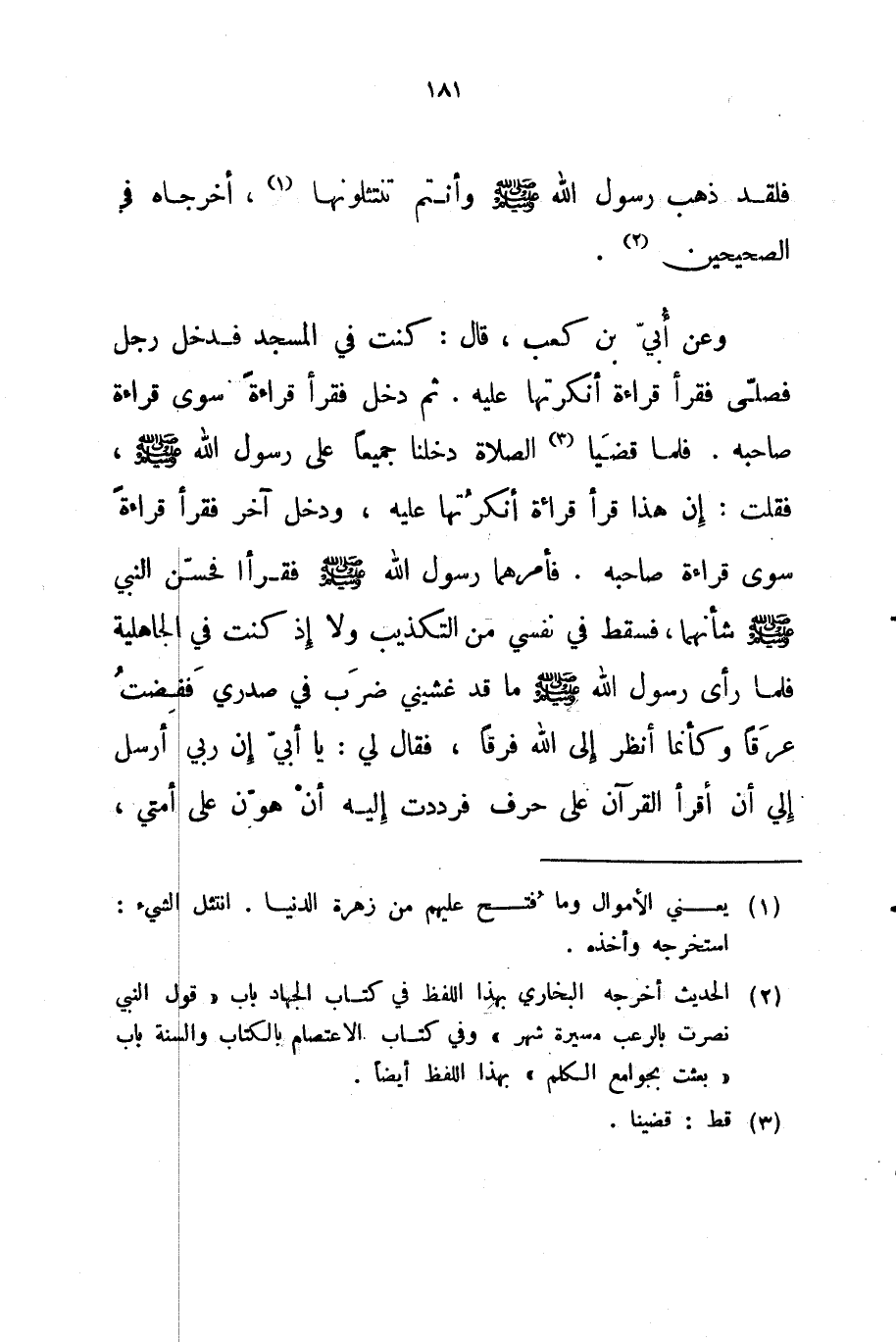 وعن أبي بن كعب قال كنت في المسجد فدخل رجل فصلى فقرأ قراءة أنكرتها عليه ثم دخل فقرأ قراءة سوى قراءة صاحبه فلما قضيا الصلاة دخلنا جميعا على رسول الله صلى الله عليه و سلم فقلت إن هذا قرأ قراءة أنكرتها عليه ودخل آخر فقرأ قراءة سوى قراءة صاحبه فأمرهما رسول الله صلى الله عليه و سلم فقرأ فحسن النبي صلى الله عليه و سلم شأنهما فسقط في نفسي من التكذيب ولا إذ كنت في الجاهلية فلما رأى رسول الله صلى الله عليه و سلم ما قد غشيني ضرب في صدري ففضت عرقا وكأنما أنظر إلى الله فرقا فقال لي يا أبي إن ربي أرسل إلي أن أقرأ القرآن على حرف فرددت إليه أن هون على أمتي
