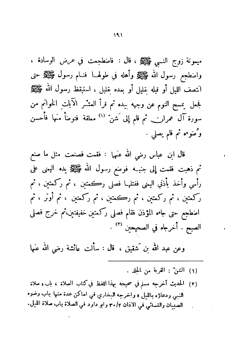 ميمونة زوج النبي صلى الله عليه و سلم قال فاضطجعت في عرض الوسادة واضطجع رسول الله صلى الله عليه و سلم وأهله في طولها فنام رسول الله صلى الله عليه و سلم حتى انتصف الليل أو قبله بقليل أو بعده بقليل استيقظ رسول الله صلى الله عليه و سلم فجعل يمسح النوم عن وجهه بيده ثم قرأ العشر الآيات الخواتم من سورة آل عمران ثم قام إلى شن معلقة فتوضأ منها فأحسن وضوءه ثم قام يصلي