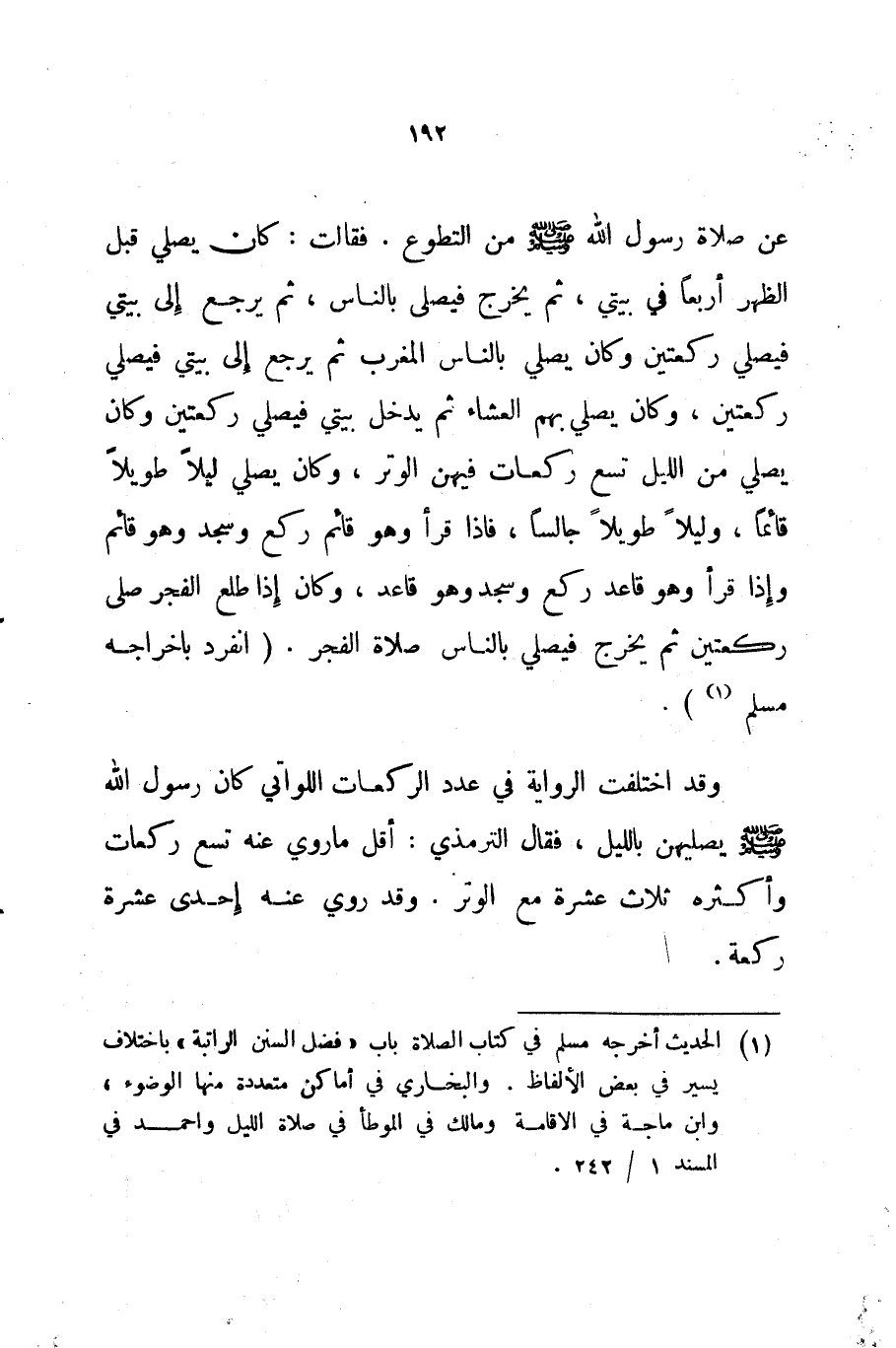 وقد اختلفت الرواية في عدد الركعات اللواتي كان رسول الله صلى الله عليه و سلم يصليهن بالليل فقال الترمذي أقل ما روي عنه تسع ركعات وأكثره ثلاث عشرة مع الوتر وقد روي عنه إحدى عشرة ركعة