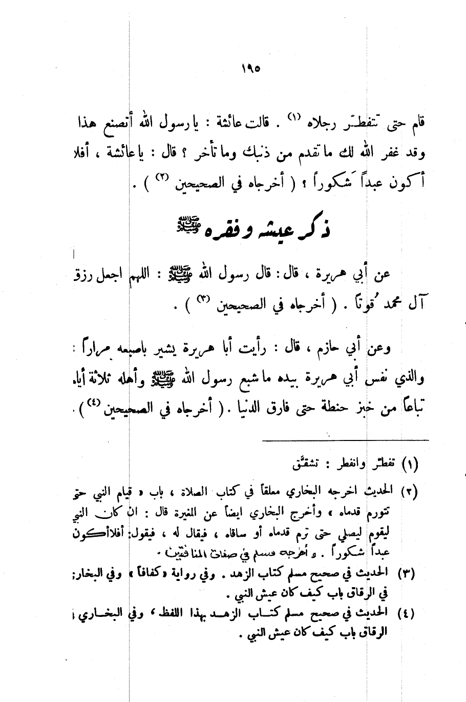 قام حتى تتفطر رجلاه قالت عائشة يا رسول الله أتصنع هذا وقد غفر الله لك ما تقدم من ذنبك وما تأخر قال يا عائشة أفلا أكون عبدا شكورا أخرجاه في الصحيحين
