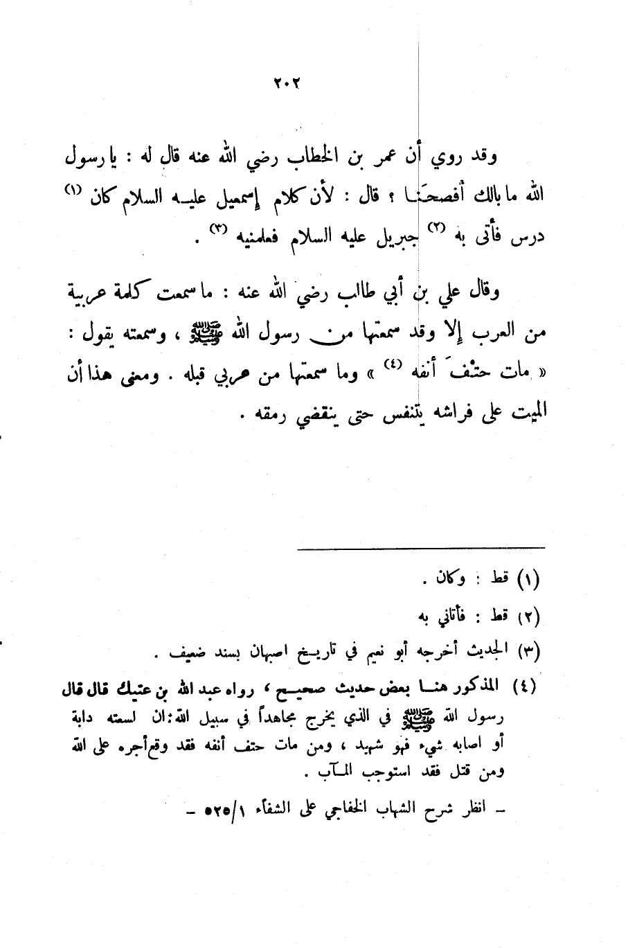 وقال علي بن أبي طالب رضي الله عنه ما سمعت كلمة عربية من العرب إلا وقد سمعتها من رسول الله صلى الله عليه و سلم وسمعته يقول مات حتف أنفه وما سمعتها من عربي قبله ومعنى هذا أن الميت على فراشه يتنفس حتى ينقضي رمقه