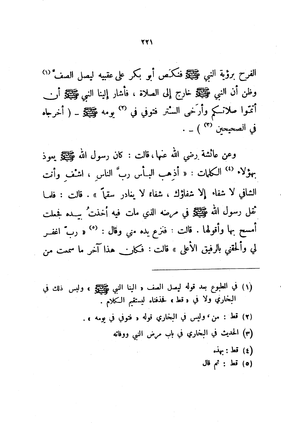 وعن عائشة رضي الله عنها قالت كان رسول الله صلى الله عليه و سلم يعوذ بهؤلاء الكلمات أذهب البأس رب الناس اشف وأنت الشافي لا شفاء إلا شفاؤك شفاء لا يغادر سقما قالت فلما ثقل رسول الله صلى الله عليه و سلم في مرضه الذي مات فيه أخذت بيده فجعلت أمسح بها وأقولها قالت فنزع يده مني وقال رب أغفر لي وألحقني بالرفيق الأعلى قالت فكان هذا آخر ما سمعت من