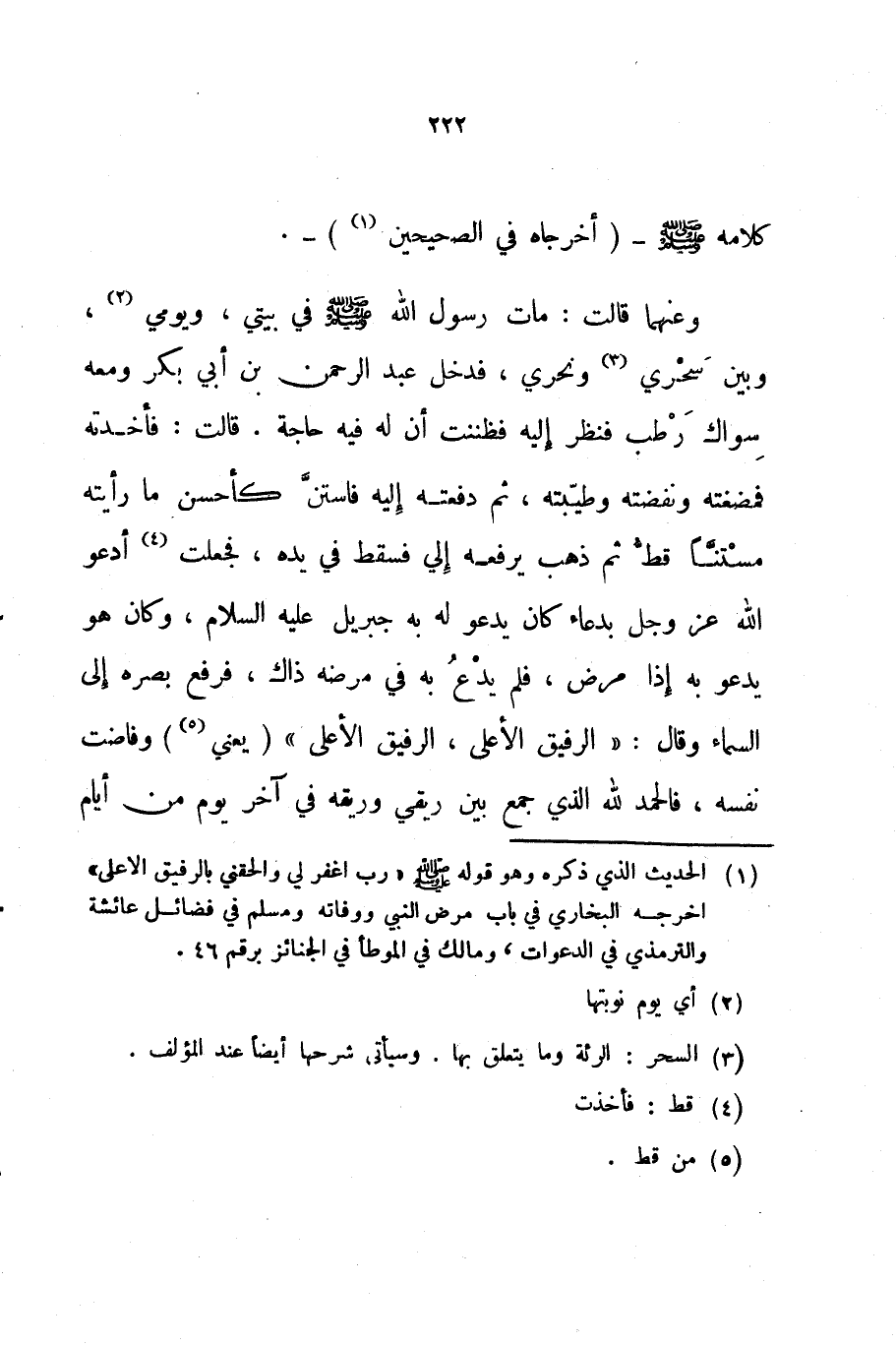 وعنهما قالت مات رسول الله صلى الله عليه و سلم في بيتي ويومي وبين سحري ونحري فدخل عبد الرحمن بن أبي بكر ومعه سواك رطب فنظر إليه فظننت أن له فيه حاجة قالت فأخذته فمضغته ونفضته وطيبته ثم دفعته إليه فاستن كأحسن ما رأيته مستنا قط ثم ذهب يرفعه إلي فسقط في يده فجعلت أدعو الله عز و جل بدعاء كان يدعو له به جبريل عليه السلام وكان هو يدعو به إذا مرض فلم يدع به في مرضه ذاك فرفع بصره إلى السماء وقال الرفيق الأعلى الرفيق الأعلى يعني وفاضت نفسه فالحمد لله الذي جمع بين ريقي وريقه في آخر يوم من أيام