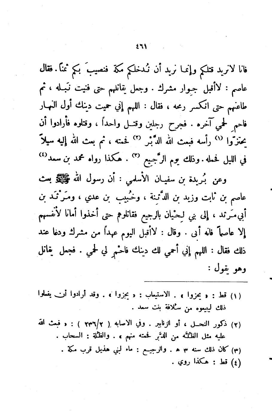 فإنا لا نريد قتلكم وإنما نريد أن ندخلكم مكة فنصيب بكم ثمنا فقال عاصم لاأقبل جوار مشرك وجعل يقاتلهم حتى فنيت نبله ثم طاعنهم حتى انكسر رمحه فقال اللهم إني حميت دينك أول النهار فاحم لحمي آخره فجرح رجلين وقتل واحدا وقتلوه فأرادوا أن يحتزوا رأسه فبعث الله الدبر فحمته ثم بعث الله إليه سبيلا في الليل فحمله وذلك يوم الرجيع هكذا رواه محمد بن سعد