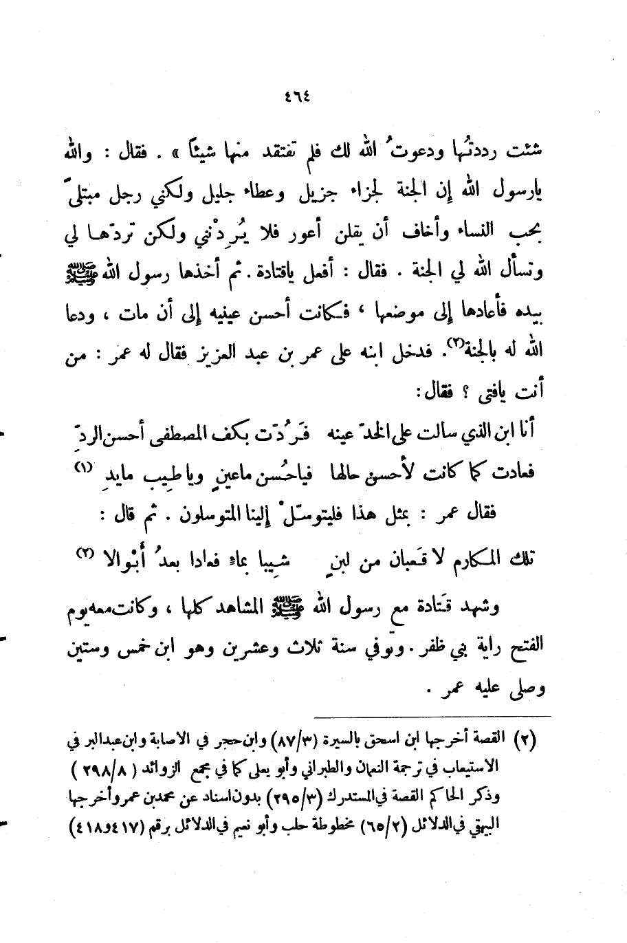 شئت رددتها ودعوت الله لك فلم تفتقد منها شيئا فقال والله يا رسول الله إن الجنة لجزاء جزيل وعطاء جليل ولكني رجل مبتلى بحب النساء وأخاف أن يقلن أعور فلا يردنني ولكن تردها لي وتسأل الله لي الجنة فقال أفعل يا قتادة ثم أخذها رسول الله صلى الله عليه و سلم بيده فأعادها إلى موضعها فكانت أحسن عينيه إلى أن مات ودعا الله له بالجنة فدخل ابنه على عمر بن عبد العزيز فقال له عمر من أنت يا فتى فقال