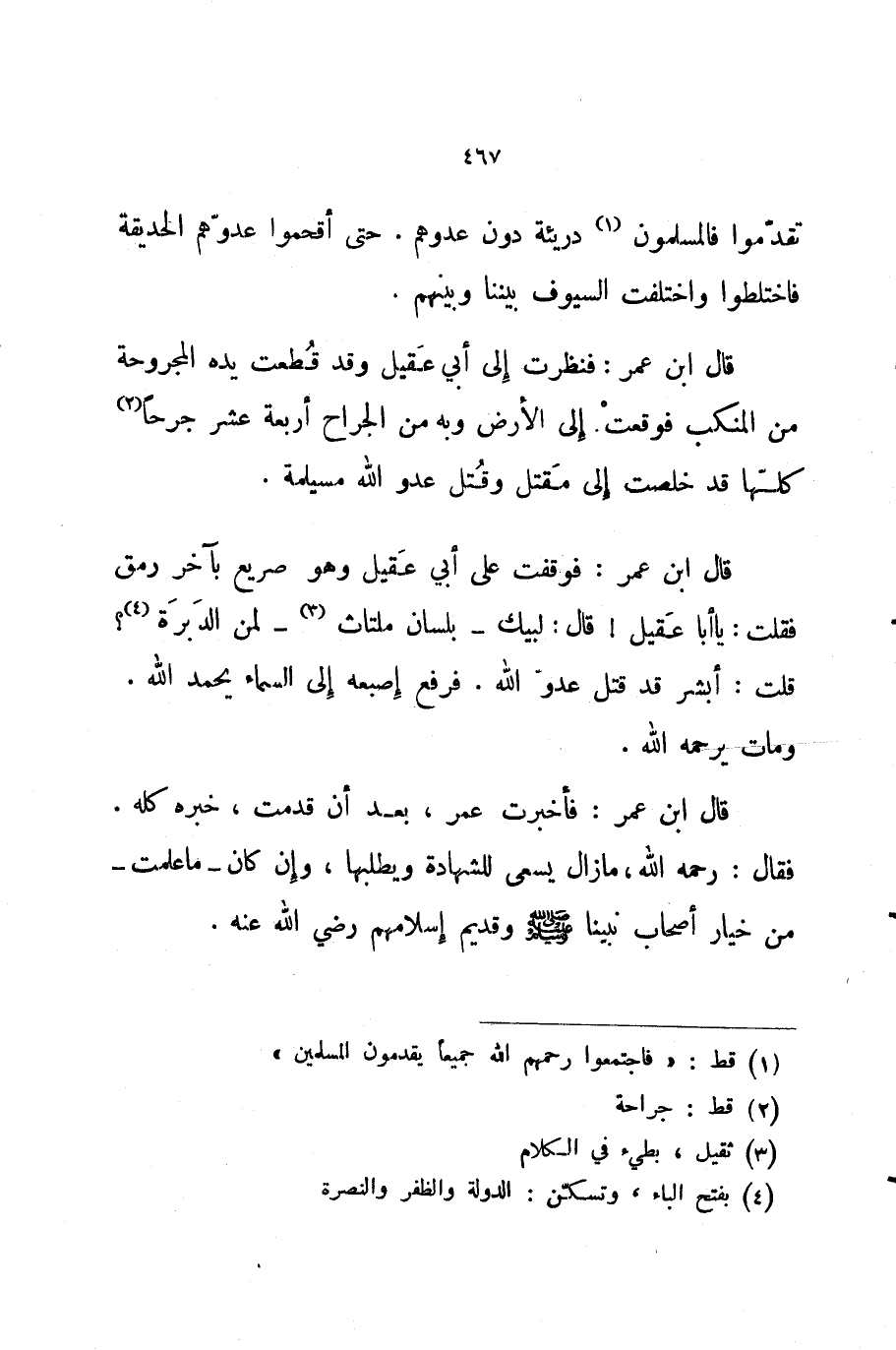 قال ابن عمر فوقفت على أبي عقيل وهو صريع بآخر رمق فقلت يا أبا عقيل قال لبيك بلسان ملتاث لمن الدبرة قلت أبشر قد قتل عدو الله فرفع إصبعه إلى السماء يحمد الله ومات يC