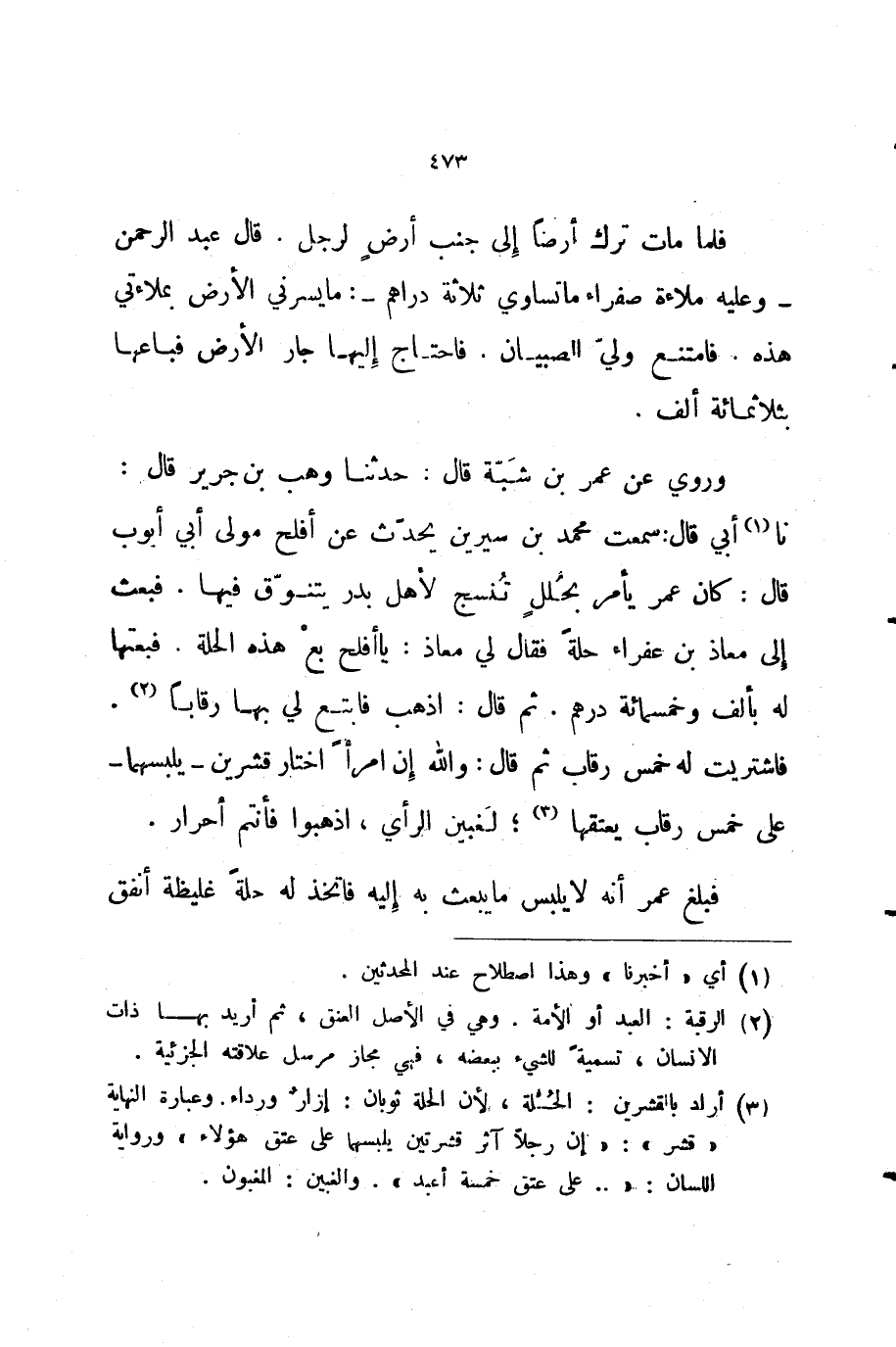 وروي عن عمر بن شبة قال حدثنا وهب بن جرير قال نا أبي قال سمعت محمد بن سيرين يحدث عن أفلح مولى أبي أيوب قال كان عمر يأمر بحلل تنسج لأهل بدر يتنوق فيها فبعث إلى معاذ بن عفراء حلة فقال لي معاذ يا أفلح بع هذه الحلة فبعتها له بألف وخمسمائة درهم ثم قال اذهب فابتع لي بها رقابا