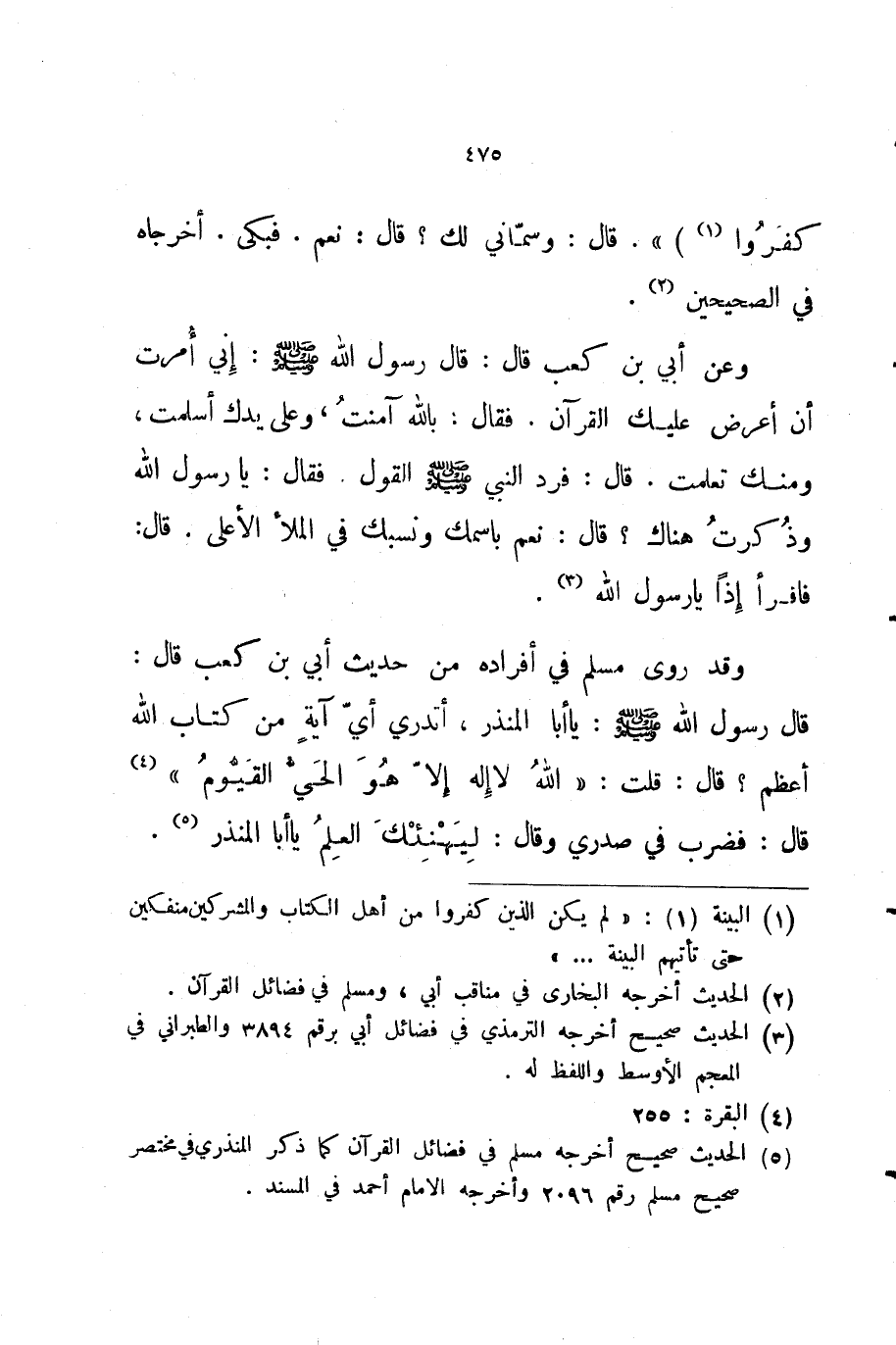 وعن أبي بن كعب قال قال رسول الله صلى الله عليه و سلم إني أمرت أن أعرض عليك القرآن فقال بالله آمنت وعلى يدك أسلمت ومنك تعلمت قال فرد النبي صلى الله عليه و سلم القول فقال يا رسول الله وذكرت هناك قال نعم باسمك ونسبك في الملأ الأعلى قال فاقرأ إذا يا رسول الله