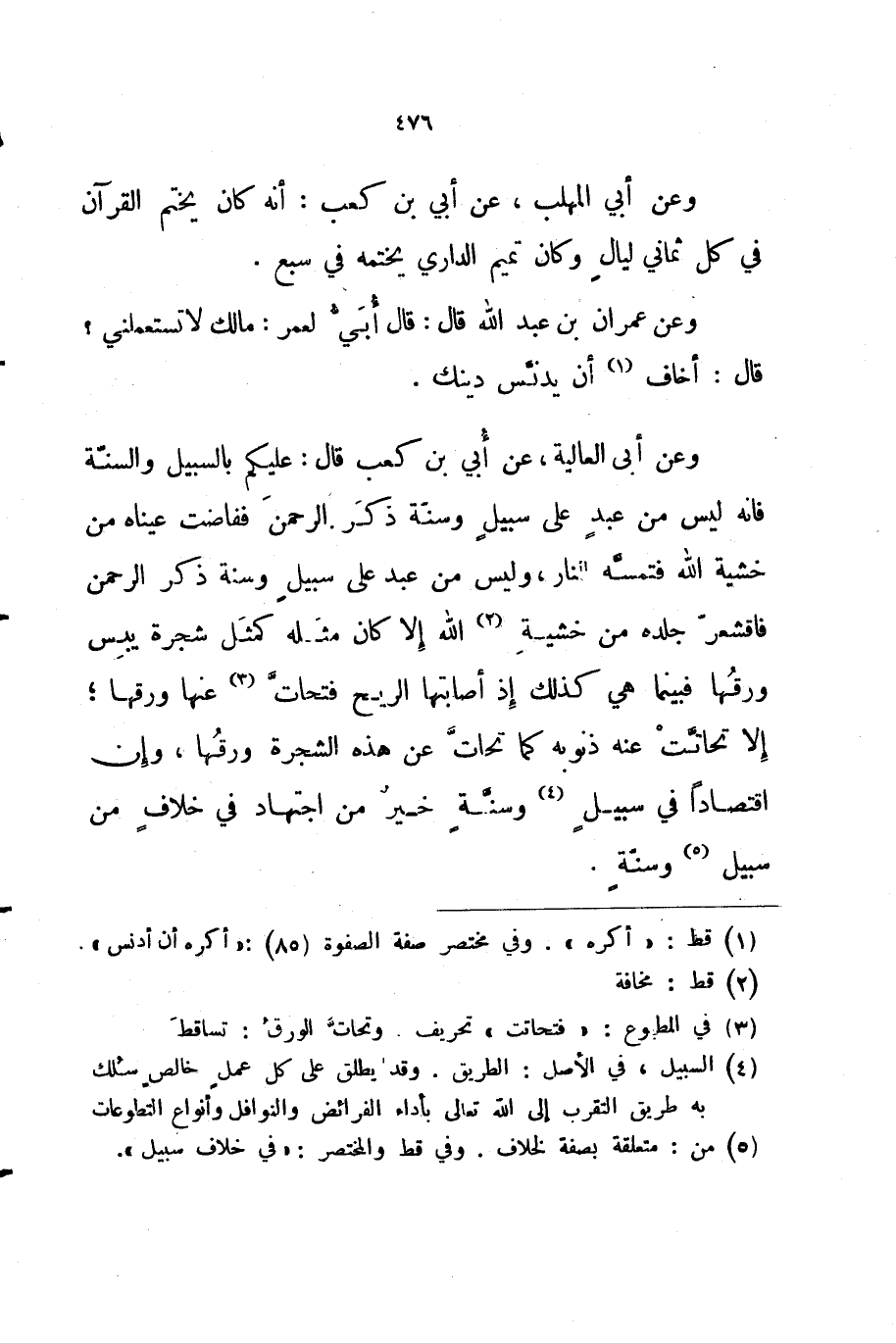 وعن أبي العالية عن أبي بن كعب قال عليكم بالسبيل والسنة فانه ليس من عبد على سبيل وسنة ذكر الرحمن ففاضت عيناه من خشية الله فتمسه النار وليس من عبد على سبيل وسنة ذكر الرحمن فاقشعر جلده من خشية الله إلا كان مثله كمثل شجرة يبس ورقها فبينما هي كذلك إذ أصابتها الريح فتحات عنها ورقها إلا تحاتت عنه ذنوبه كما تحات عن هذه الشجرة ورقها وإن اقتصاد في سبيل وسنة خير من اجتهاد في خلاف من سبيل وسنة
