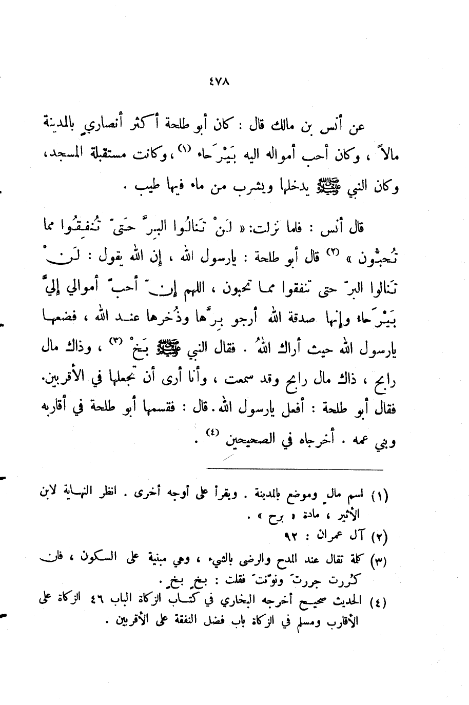 عن أنس بن مالك قال كان أبو طلحة أكثر أنصاري بالمدينة مالا وكان أحب أمواله إليه بيرحاء وكانت مستقبلة المسجد وكان النبي صلى الله عليه و سلم يدخلها ويشرب من ماء فيها طيب