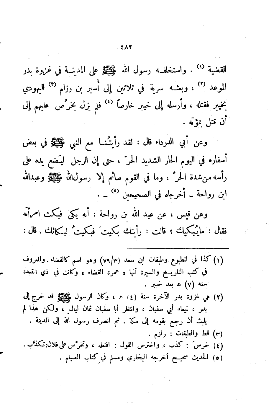 القضية واستخلفه رسول الله صلى الله عليه و سلم على المدينة في غزو بدر الموعد وبعثه سرية في ثلاثين إلى أسير بن رزام اليهودي بخيبر فقتله وأرسله إلى خيبر خارصا فلم يزل يخرص عليهم إلى أن قتل بمؤتة