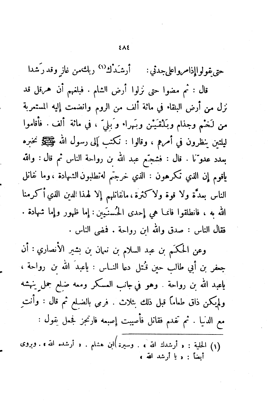 وعن الحكم بن عبد السلام بن نعمان بن بشير الأنصاري أن جعفر بن أبي طالب حين قتل دعا الناس يا عبد الله بن رواحة يا عبد الله بن رواحة وهو في جانب العسكر ومعه ضلع حمل ينهشه ولم يكن ذاق طعاما قبل ذلك بثلاث فرمى بالضلع ثم قال وأنت مع الدنيا ثم تقدم فقاتل فأصيبت إصبعه فارتجز فجعل يقول