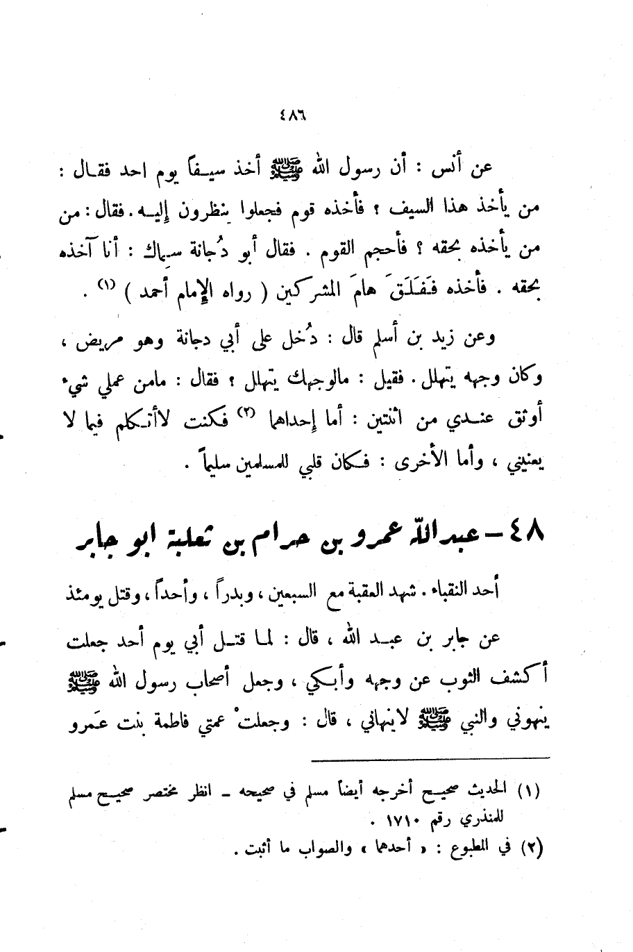 وعن زيد بن أسلم قال دخل على أبي دجانة وهو مريض وكان وجهه يتهلل فقيل مالوجهك يتهلل فقال ما من عملي شيء أوثق عندي من اثنتين أما إحداهما فكنت لاأتكلم فيما لا يعنيني وأما الأخرى فكان قلبي للمسلمين سليما 48 عبد الله عمرو بن حرام بن ثعلبة أبو جابر
