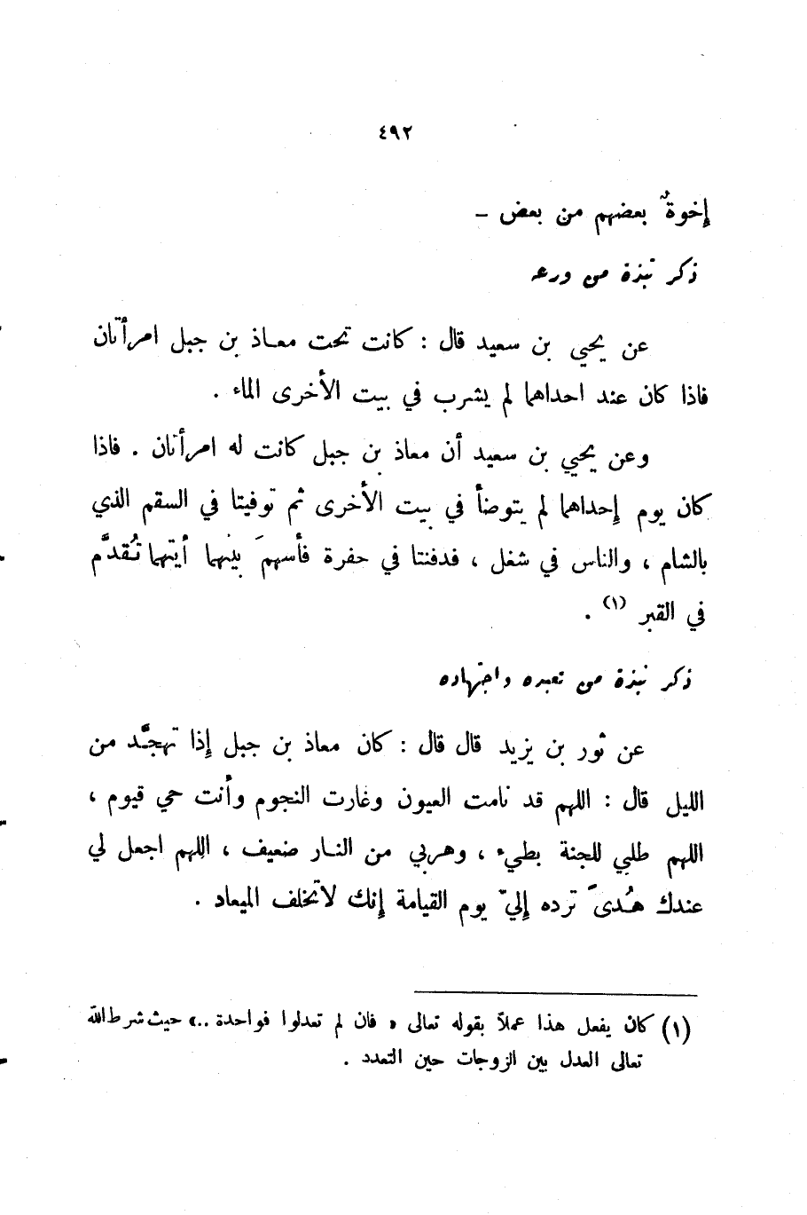 عن يحيى بن سعيد قال كانت تحت معاذ بن جبل امرأتان فإذا كان عند إحداهما لم يشرب في بيت الأخرى الماء