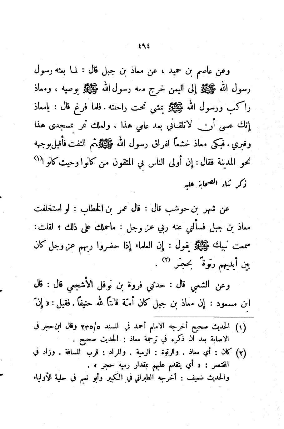 عن شهر بن حوشب قال قال عمر بن الخطاب لو استخلفت معاذ بن جبل فسألني عنه ربي عز و جل ما حملك على ذلك لقلت سمعت نبيك صلى الله عليه و سلم يقول إن العلماء إذا حضروا ربهم عز و جل كان بين أيديهم رتوة بحجر