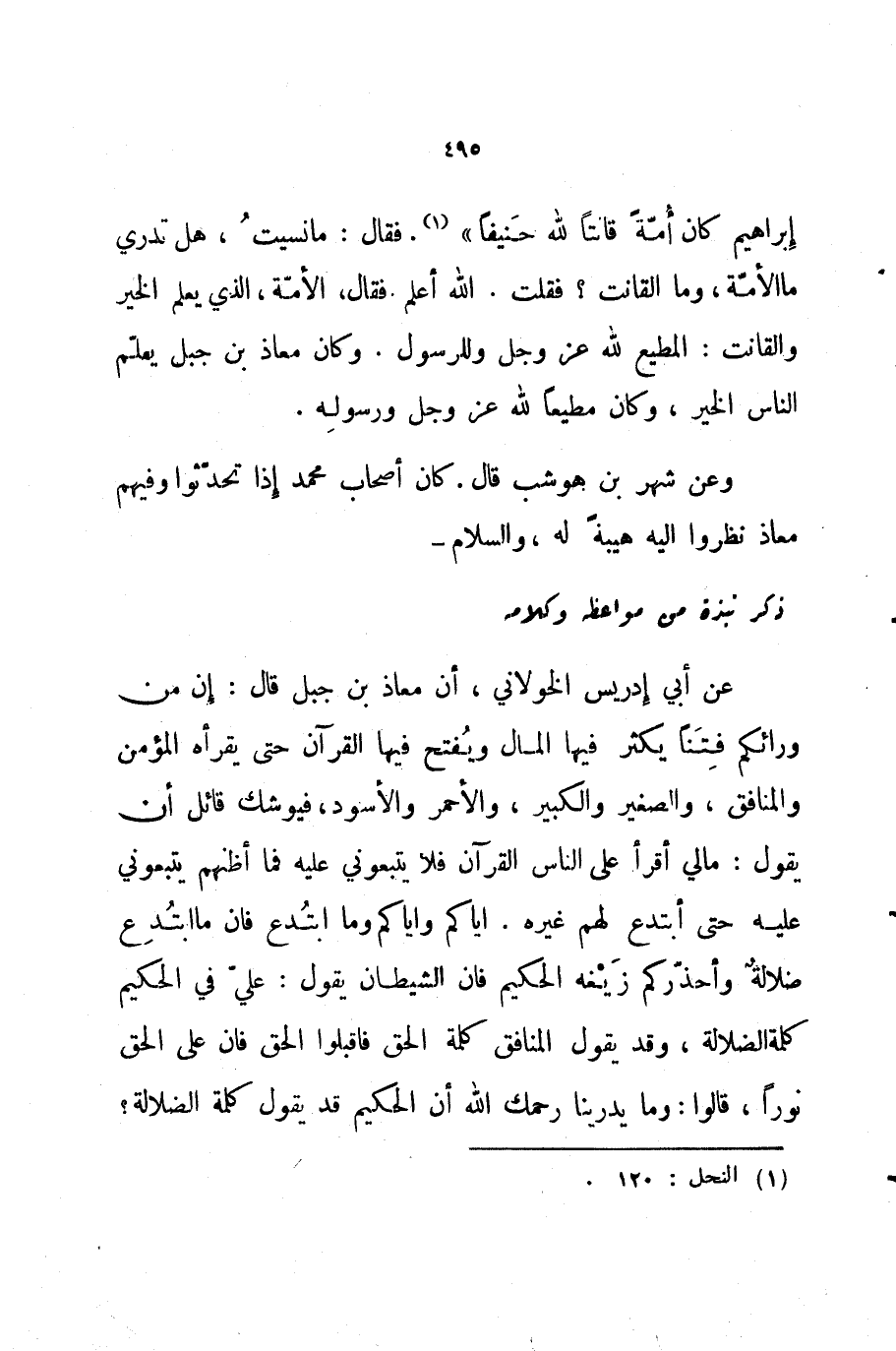إبراهيم كان أمه قانتا لله حنيفا فقال ما نسيت هل تدري ما الأمة وما القانت فقلت الله أعلم فقال الأمة الذي يعلم الخير والقانت المطيع لله عز و جل وللرسول وكان معاذ بن جبل يعلم الناس الخير وكان مطيعا لله لاD ورسوله